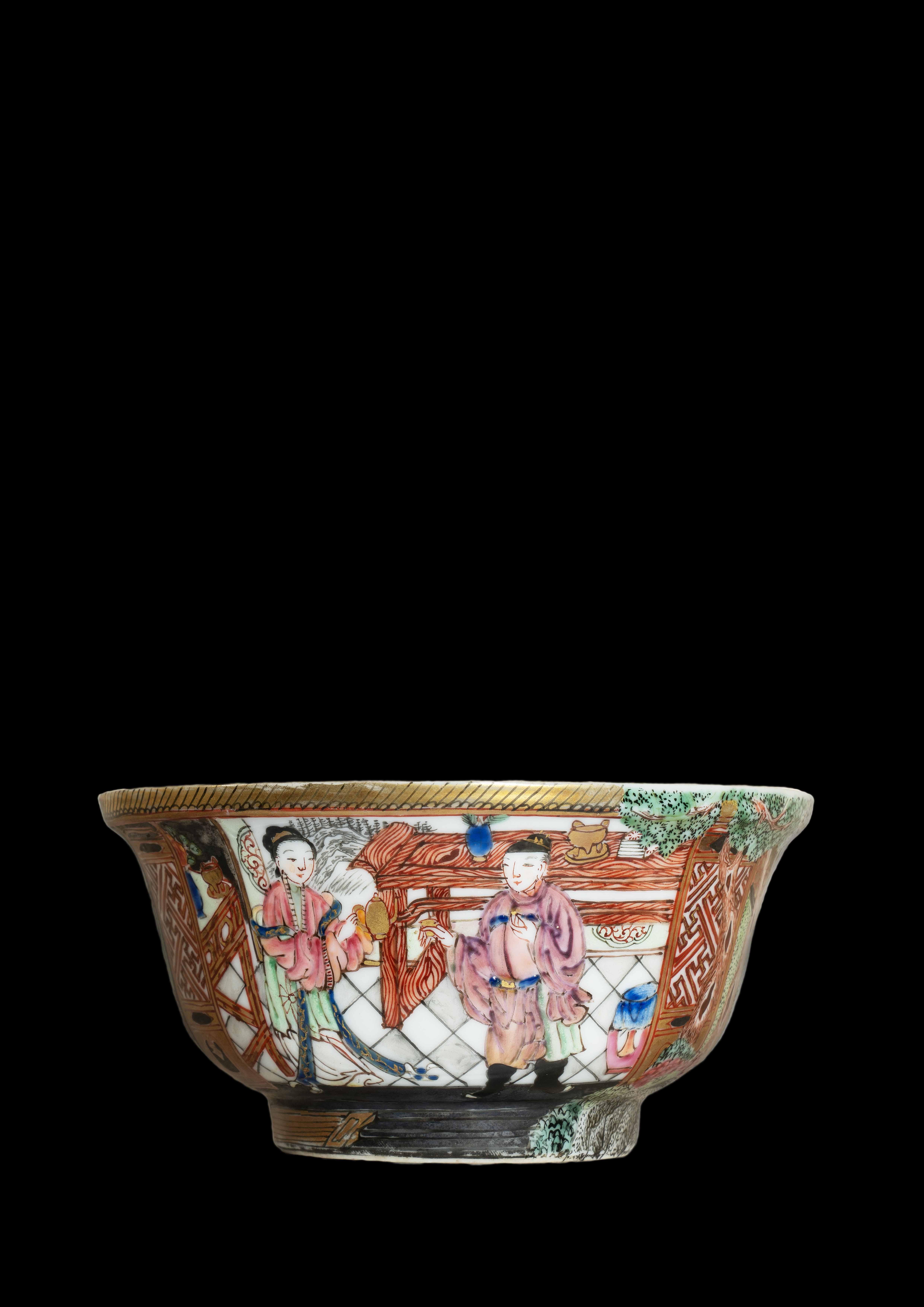 An eggshell porcelain small bowl decorated in famille rose with a continuous scene of ladies on horseback and a couple in an interior.