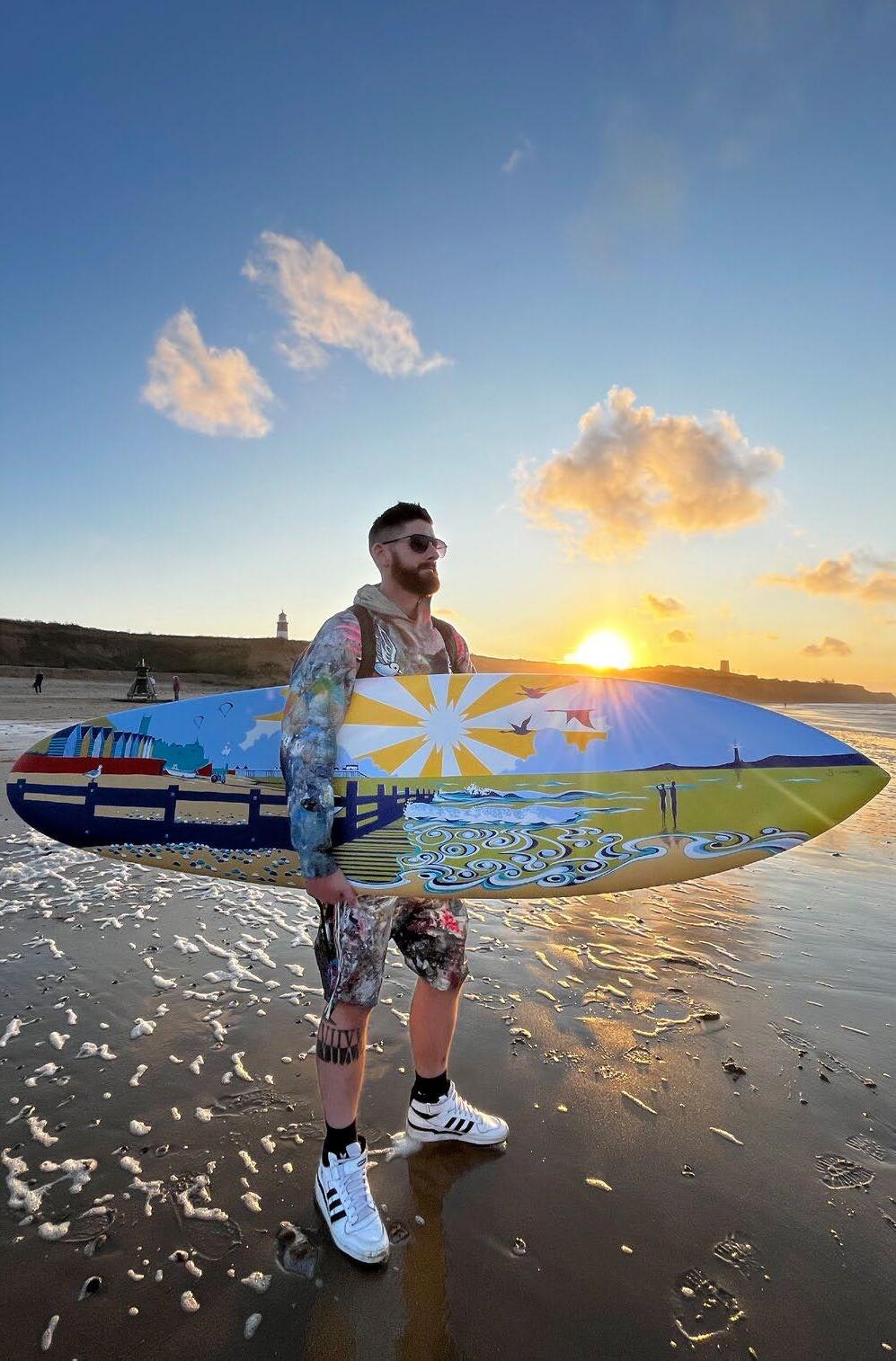 I pride myself on being a self-taught artist because it means that I am free to move in different directions in my artistic career. For example, I have used Surfboard’s to paint onto in the past as well as a real three-dimensional beach hut on the East Anglian coast of England.
