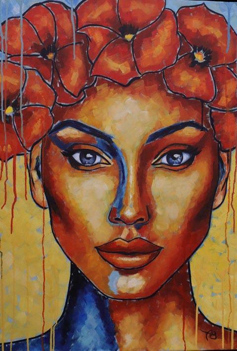 Set against a stark bottle green backdrop, Flower Girl alludes to the flower power of the 1960s and 1970s. In a nostalgic reference to the pacifist beliefs of the time period, the female figure in Nana’s painting wears the typical patterned headdress and rounded glasses which connotes the fashion of the time. Draped in vivid colour tones and leaning towards a fauvist style of painting, the artist’s cartoon-like female figure gazes into the distance and lends herself to observation by immediately capturing the viewer’s attention.