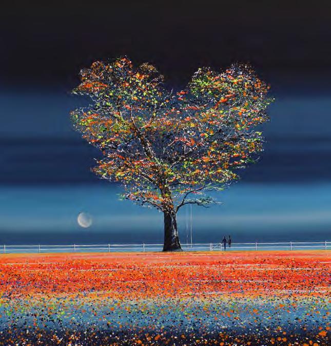 Depicting a serene and inviting landscape, Thomas experiments with a variety of complimentary colours and textures. With a heart-shaped tree in the centre of the composition, its autumn leaves splinter the foreground and demonstrate the passing of the seasons thereby speculatively initiating a new beginning and time of change. The fluorescent beams of neon orange mimic the colours of a sunset, and serve as the primary focal point which draws the viewer’s gaze into the scene. Alluding to the themes of love, peace and nature, Thomas portrays a world untouched by civilisation, where the earth, sky and sea converge into one. As the moon begins to rise over the horizon, two small figures are depicted looking out into the distance admiring the natural world that surrounds them. The sense of peace and stillness captured by the artist is addictively captivating, and much like the colour field painters of the 1950s, serves as a catalyst for provoking an emotion through colour in the viewer.