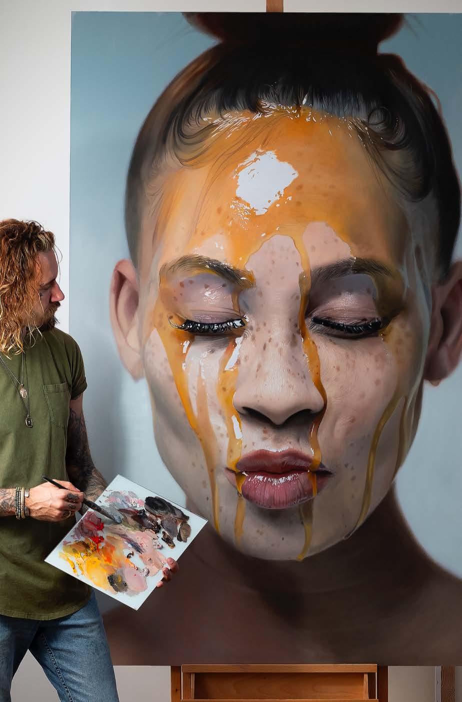 Ben Jefferey’s work is centred around two stages. The canvas is firstly primed with a base colour, and after drying, a more detailed layer is then added.