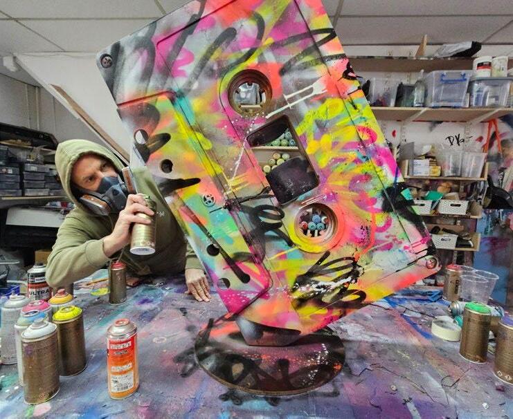 A. I love everything. Spray paint, sculpture, broken records, neon, canvas, walls, cars — I’ll even paint a toaster if it speaks to me! I don’t really have a favourite. The only medium I don’t like is silence. Art should make noise, even if it whispers.