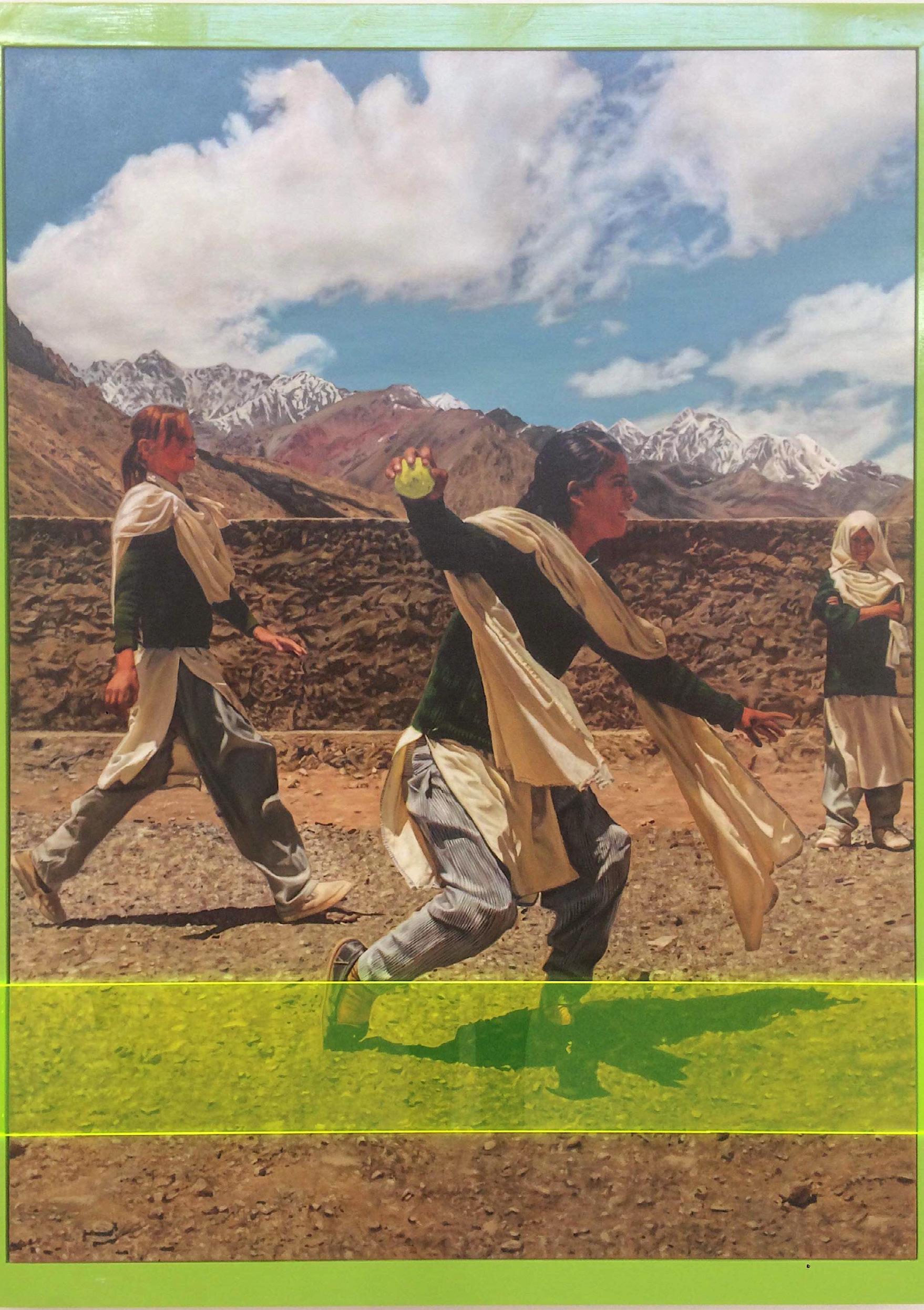 Oil on canvas, MDF, pine wood frame, enamel paint, fluorescent green acrylic plastic, chrome mirror screws 101 x 131.5 x 6.7cm