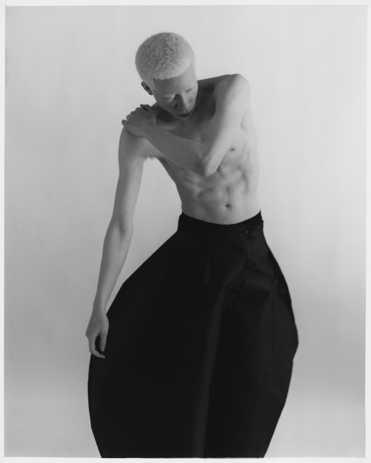 Charles is wearing oversize trousers made by the young designer Marshall James. Movement and softness are at the core of this image.