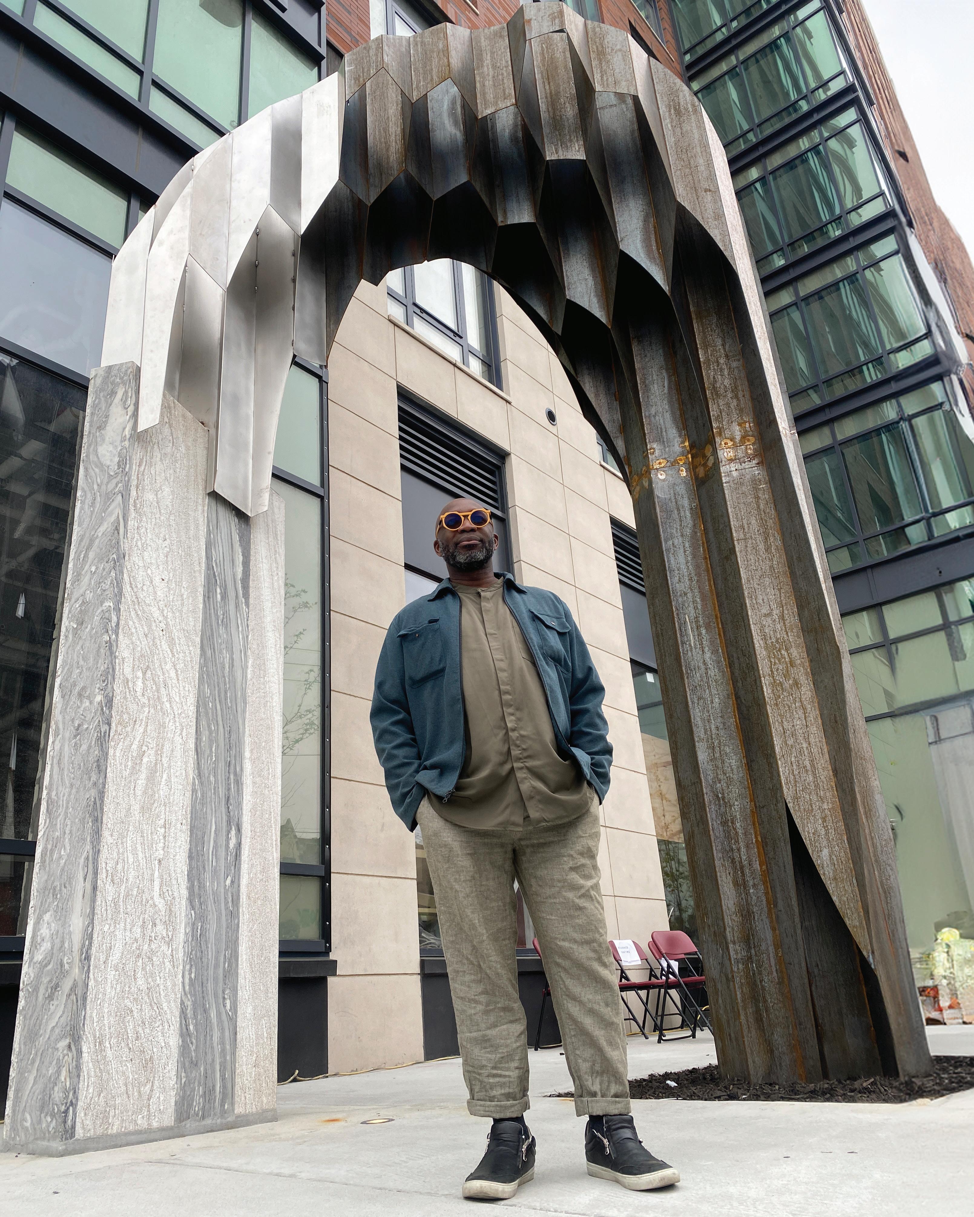 Otitigbe worked with the architect Michael DiCarlo to design "Peaceful Journey." The archway offers an invitation for people to pass through its portal, which serves as a waymarker for a peaceful journey — whether for those leaving the building or community, or for those returning home.