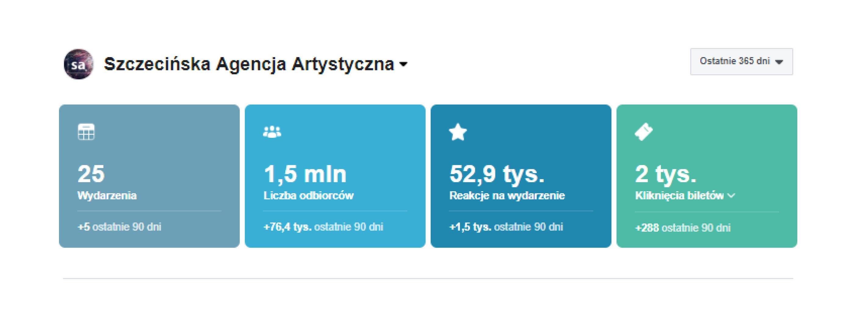 Ogólna statystyka z 2018 r. dla profilu Szczecińskiej Agencji Artystycznej na Facebooku:
