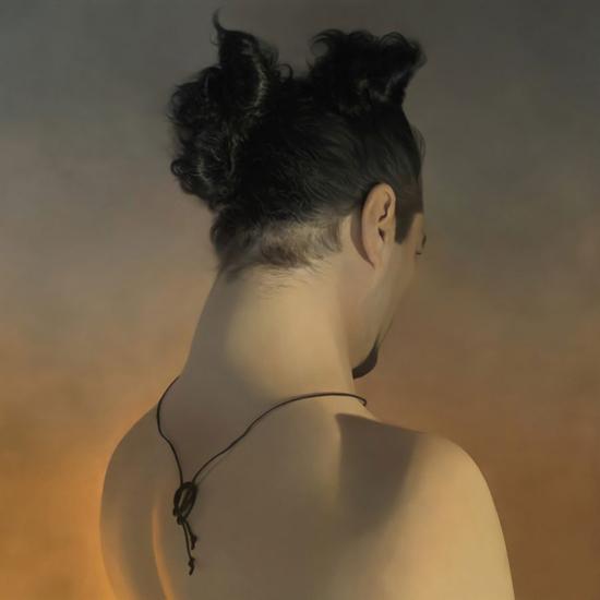The longer I study this portrait, the more I seem to see the reality of our hidden or latent natures: the mind and spirit contained within the brain. Unlike many Macri portraits, the face is turned away from the viewer, the eyes (often covered by veils or glasses elsewhere) are not visible here, as if to say that ordinary sight doesn’t necessarily lead to full understanding, or allow us to perceive what isn’t apparent. Only one ear is highlighted, suggesting that we can’t rely entirely on the physical to hear what is hidden and quiet within our psyches. Or, the artist perhaps is demonstrating that no matter how involved he becomes in his exploration of latent truths, he is still attuned to the noises of the external world. Notice how the shadow on the right shoulder can fit into the triangle formed by the necklace, which draws attention to the sensuous cleft on the back formed by the relation between muscle and bone. So very fine and alluring. Although physical beauty is present, the portrait celebrates the ineffable and spiritual in its poise, light, gold tones and quiet grace.