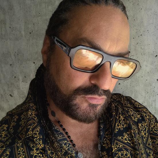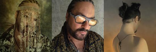 Thus, the golden shapes in the cloth (perhaps a robe) in Cosmopolitan contribute to the meaning of the portrait as much as the gold lenses of the glasses and the light shining in them. The artist has removed his glittering veil in The Lure to reveal his face in Cosmopolitan. He has also changed his clothes, but still selecting a geometric pattern of golden threads, reminiscent of the chains in The Lure. His hair remains pulled back, tightly styled. The skin's tones of the face are tinged with subdued gold, and the head tilts forward, giving prominence to the forehead, which reminds viewers of the hidden, divided brain. The mystery continues, always a compelling aspect of Macri’s art. He doesn’t let us in, for we cannot know everything; we cannot penetrate the secrets of the artist’s mind and heart, however alluring the gold and jewels and face.