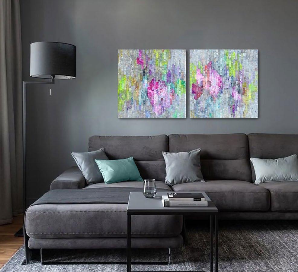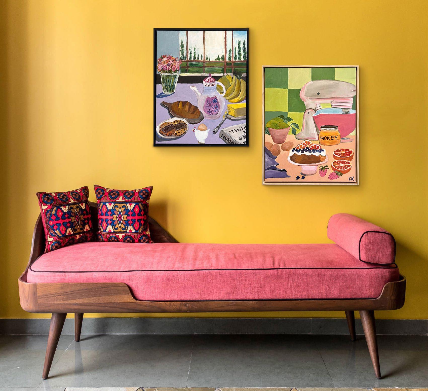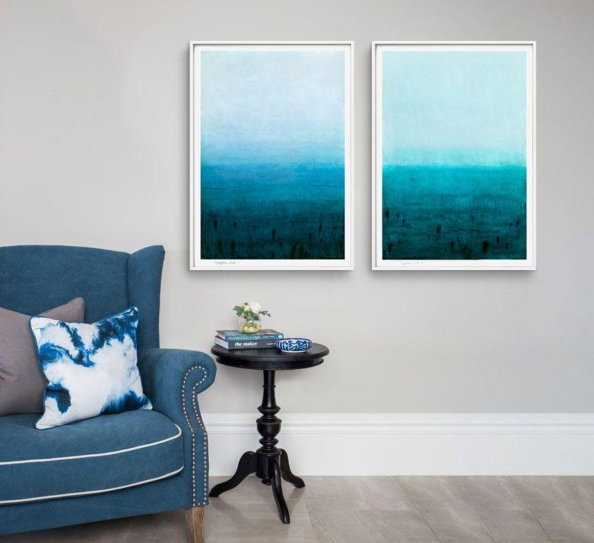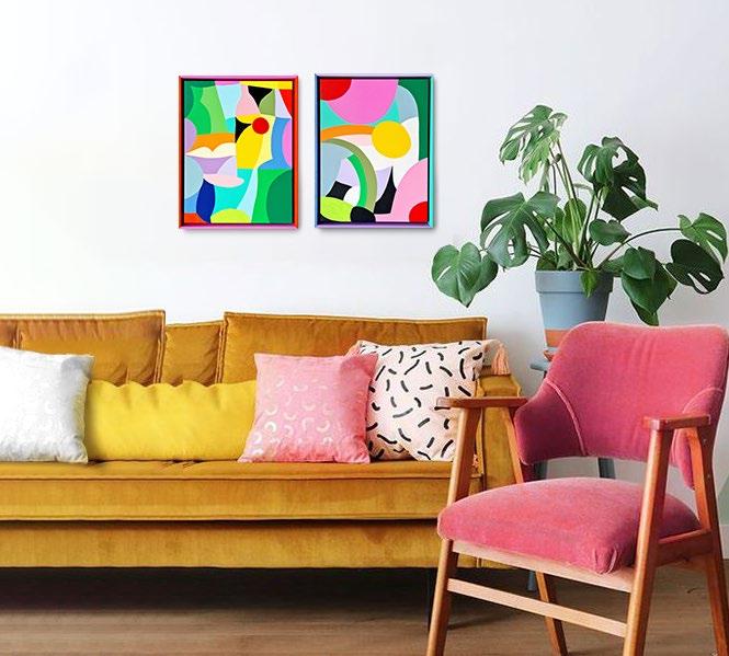 Both are acrylic on canvas, framed in raw oak.