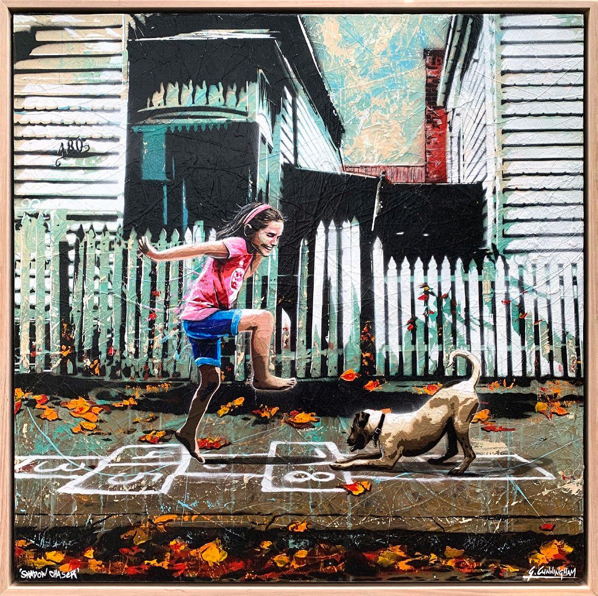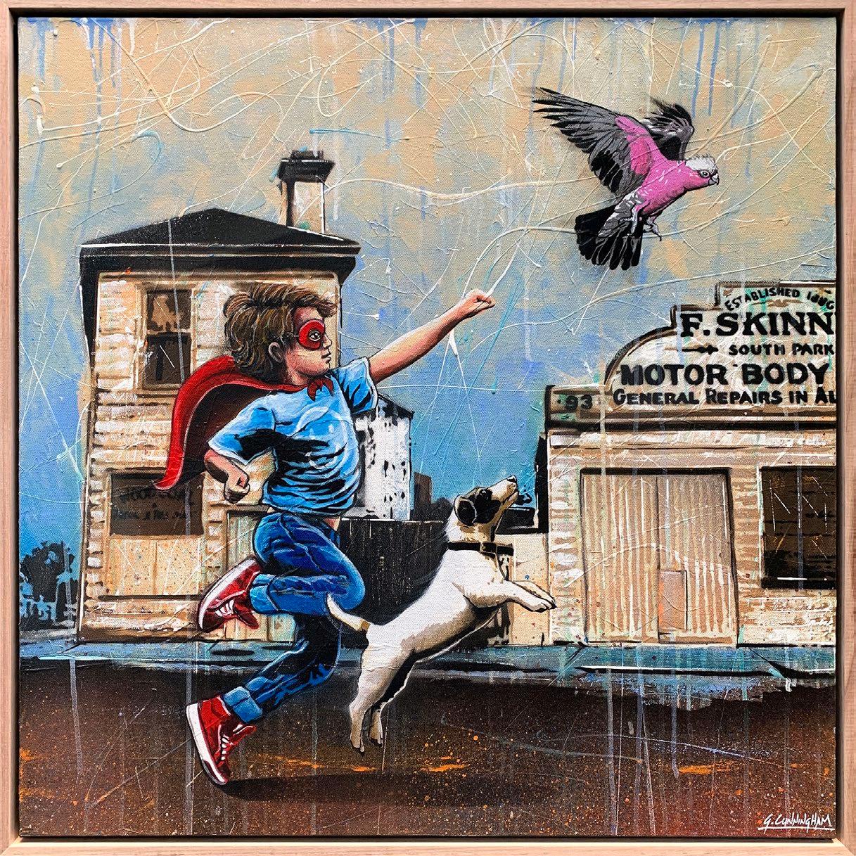 Acrylic and aerosol on poly cotton, framed in oak. 89 x 103 cm $2,500