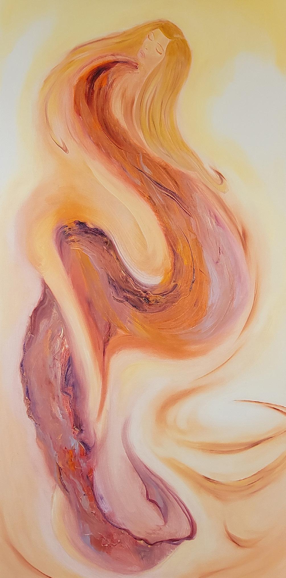 In Accepting Peace, the viewer is struck by a sense of tranquility. A figure in a vibrant red dress sits pensively, cradling a small olive branch as a dove soars above. The serenity in her posture reflects a personal acceptance, while the contrast between the dynamic red and soft greenery creates a powerful visual. The imagery of the dove, symbolizing peace, adds a layer of spiritual reflection. Tammy's ability to evoke a narrative through subtlety and color is masterful, inviting us to pause and embrace the calm within the chaos.