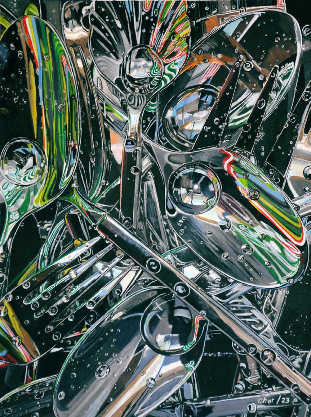 The shiny metal is one of those materials that can host endless visions....the light hits it, and the reflections are captured on the smooth, sleek surface…an artist’s dream!”