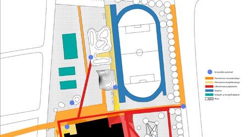 Plaani lähemalt vaadates näeme ka, kuidas kool on justkui ümbritsevaga seotud, kuid siiski omaette ja aiaga ära eraldatud. Seega soovisime alustuseks tekitada otsesed ja tuntavad sõlmed ümbritseva võrgustikuga, luues ka kogukonnale meeldiva ruumi, mida kasutama tulla. Selleks tõime koolihoovi värvilise paleti, millega erinevaid funktsioone eristada ja noortele lõbusamat keskkonda luua. Ka valitud värvid olid sümboolse tähendusega, näiteks ratastele mõeldud teed tegime punaseks, et need jätkaksid linnas juba kasutatavaid värvitud rattateid. Kollane, millega jalakäijate ala tähistada, tuli aga linnaosale omasest soojast päikese toonist. Sinise värvi võtsime kooli sümboolikast.