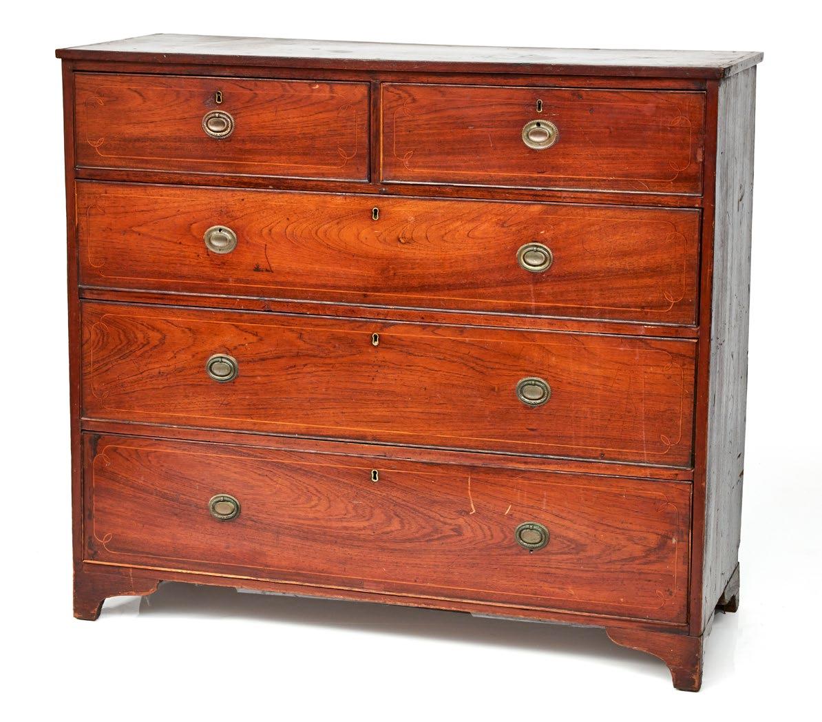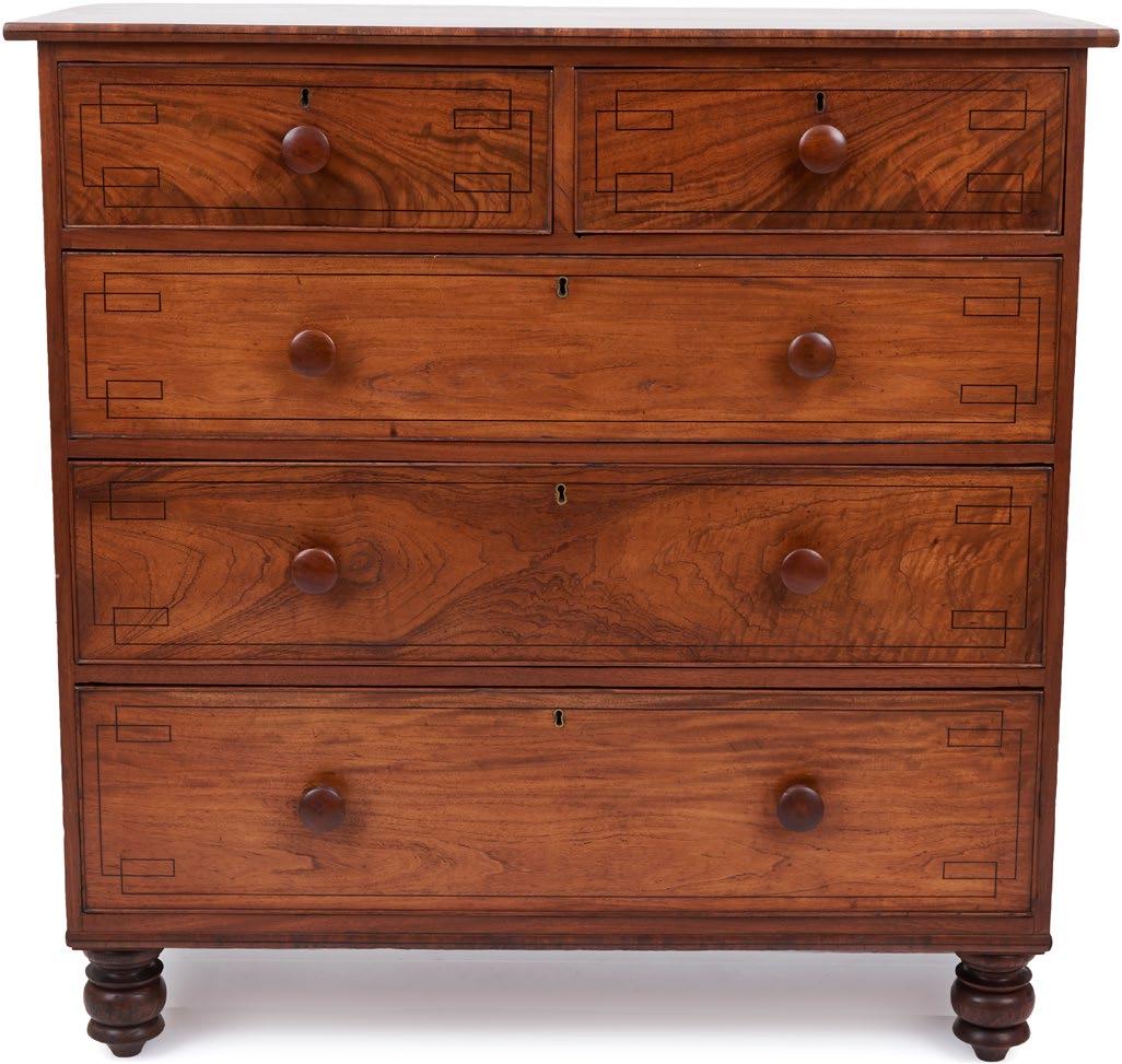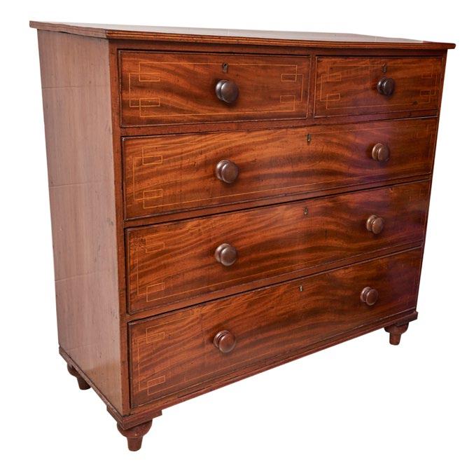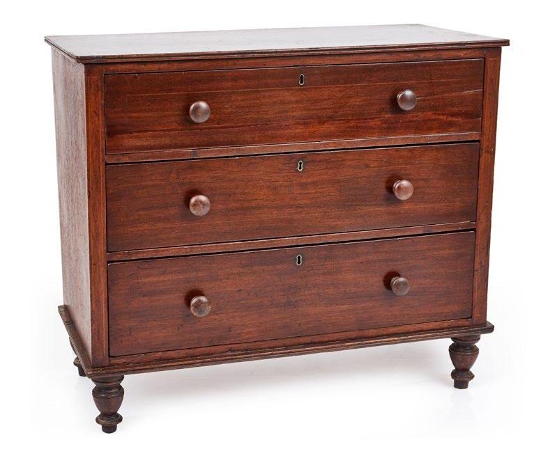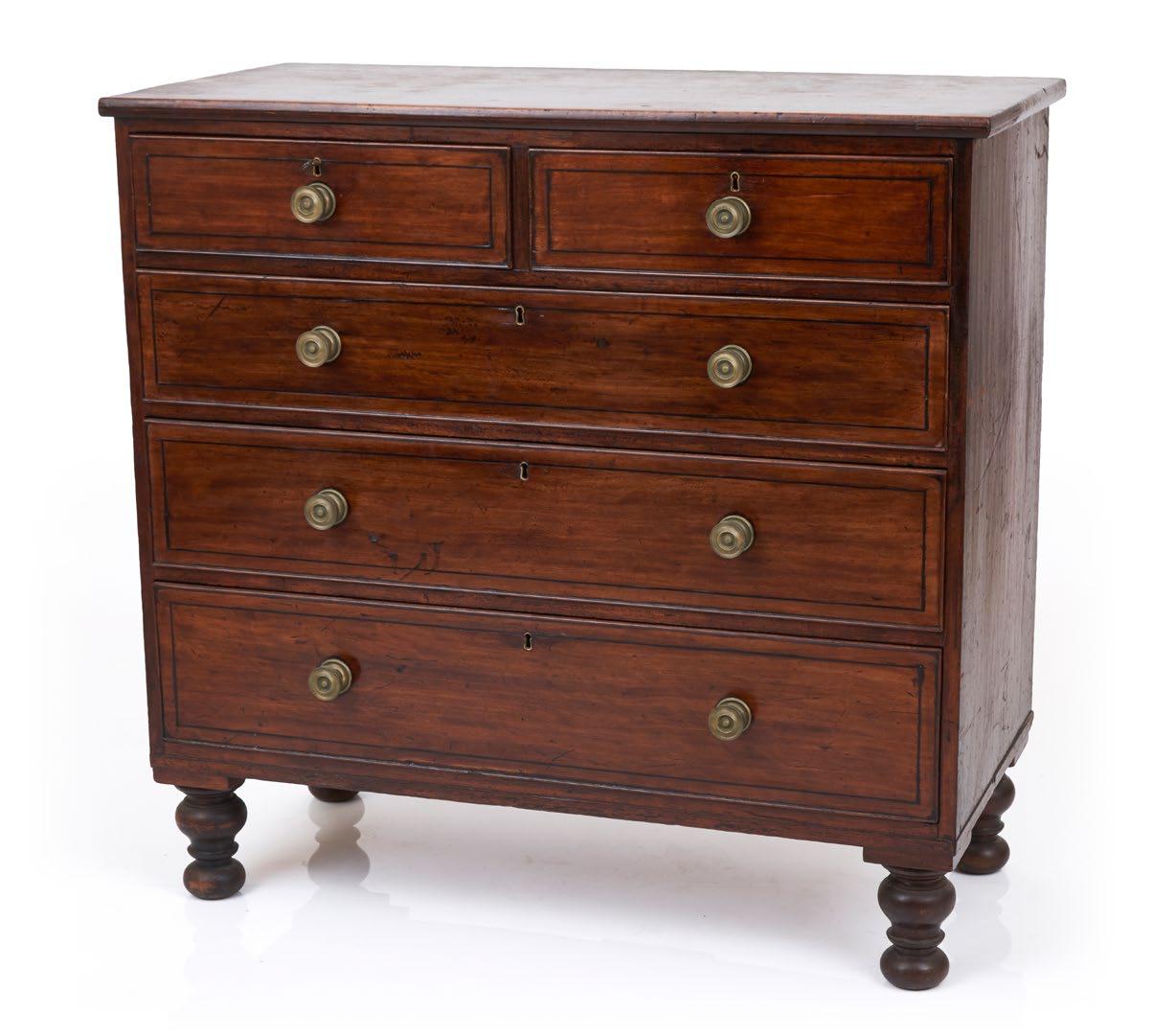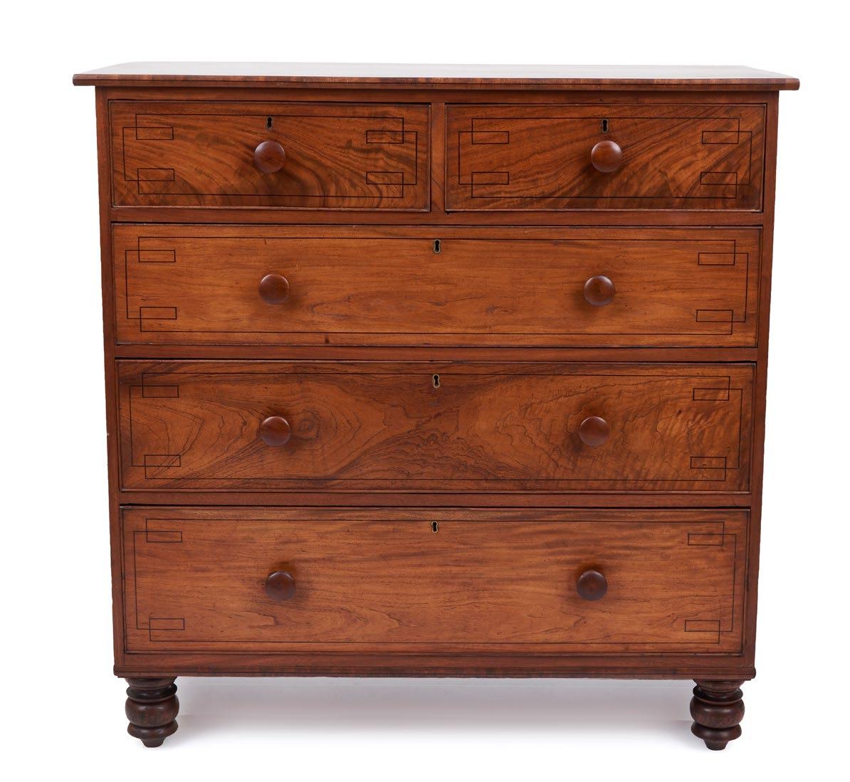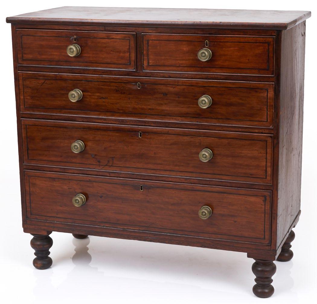 A rare and early string inlaid cedar straight front chest-of-drawers, Australian, circa 1825 119cm wide, 47cm deep, 116cm high $3,000–5,000