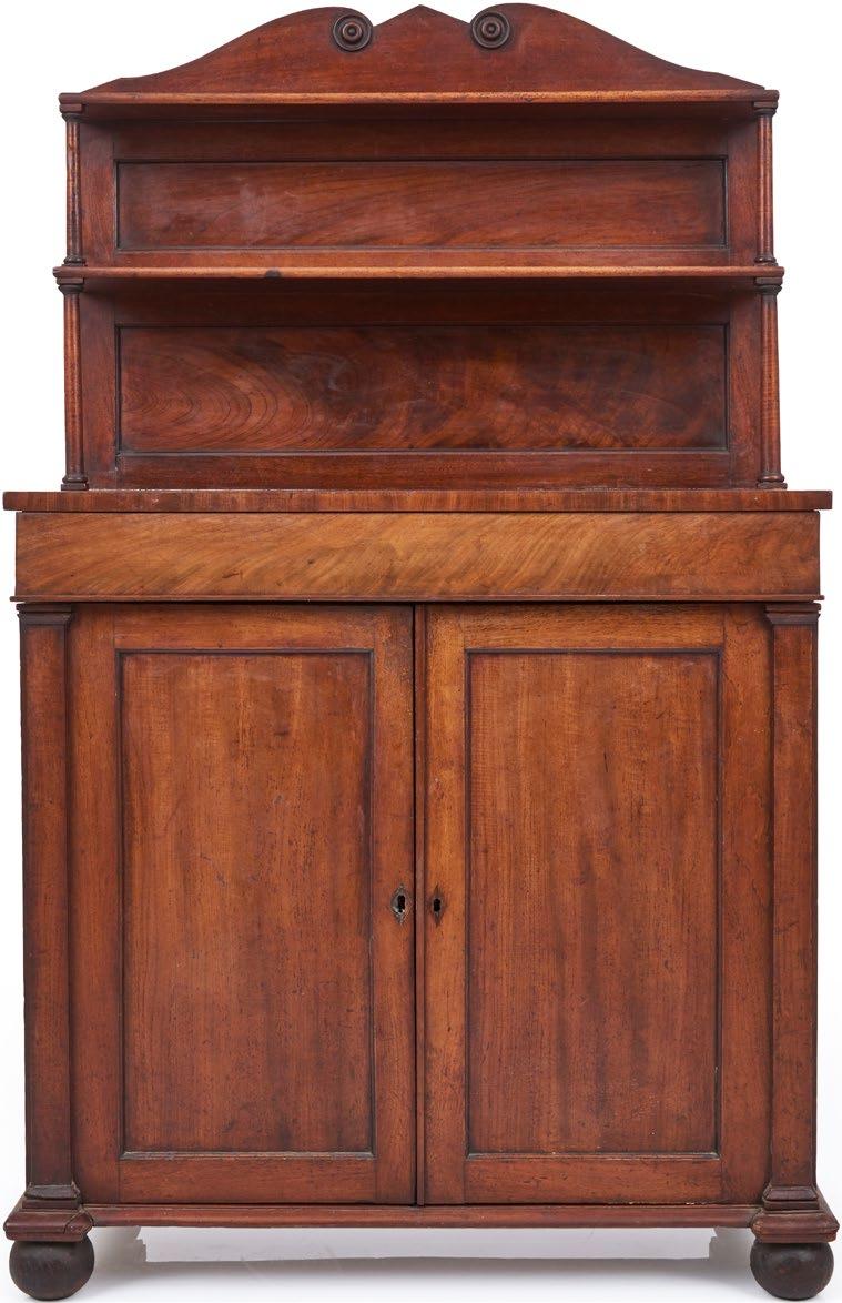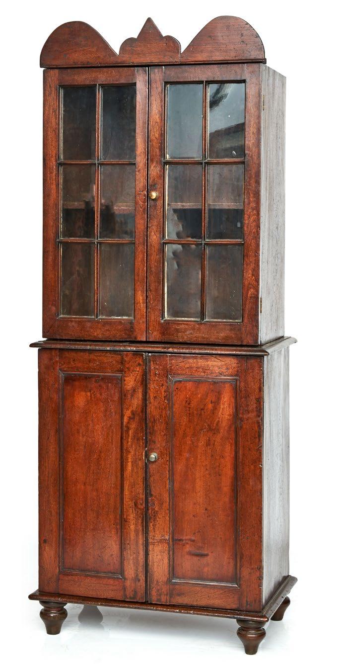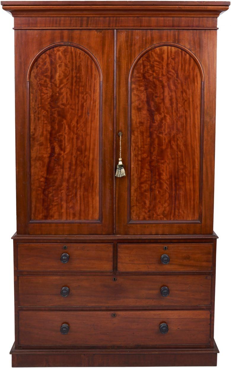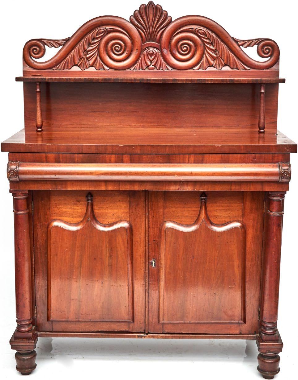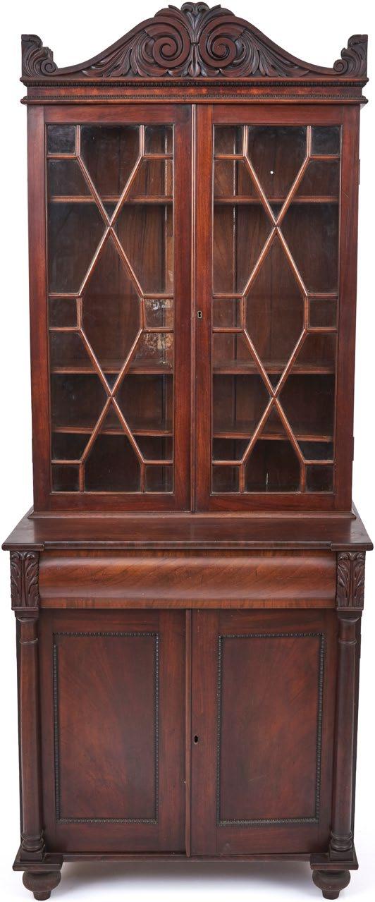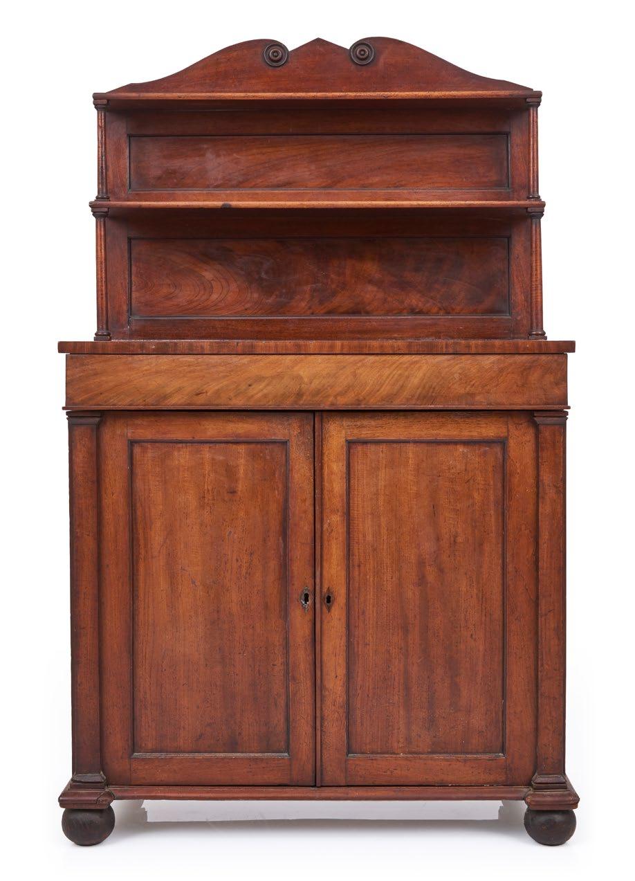 For a pediment carving of almost identical form, refer to the ‘Wallalong Bookcase’ by Hill and Sons illustrated in Australian Furniture Pictorial History and Dictionary 1788-1938, Kevin Fahy and Andrew Simpson, Casuarina Press, Sydney, page 184. It therefore could be suggested that this wardrobe was commissioned for Dr Walter Scott of Wallalong NSW. $2,500–4,000