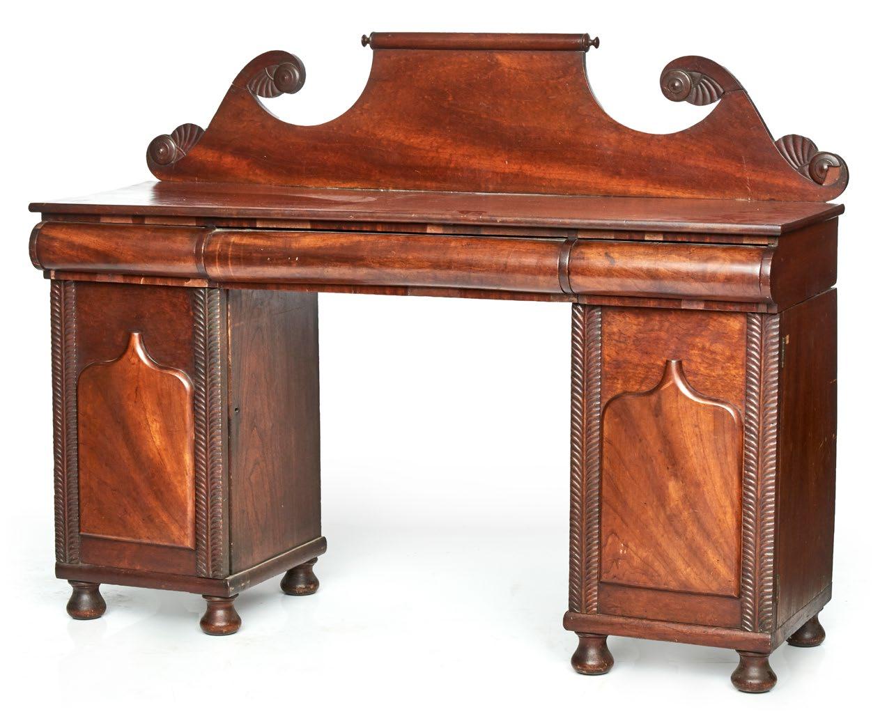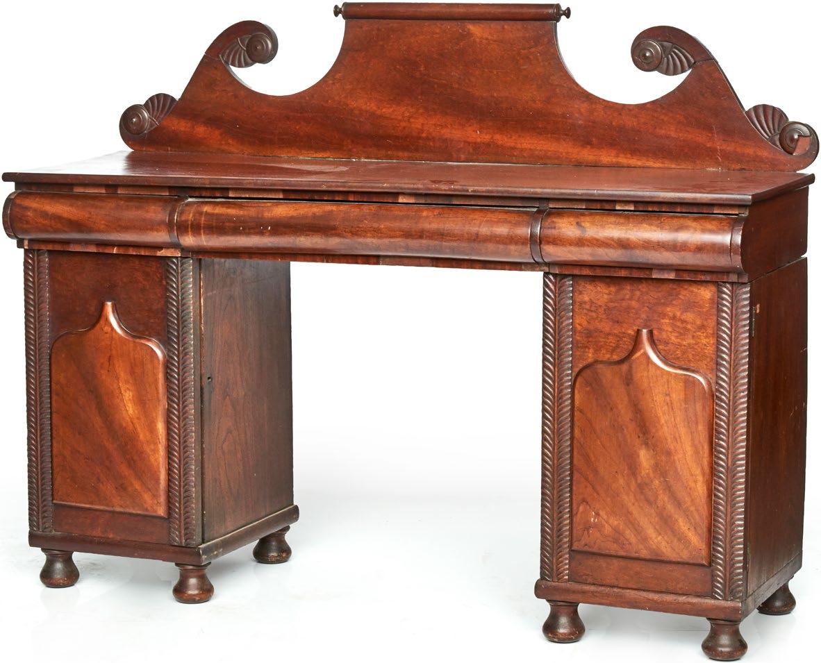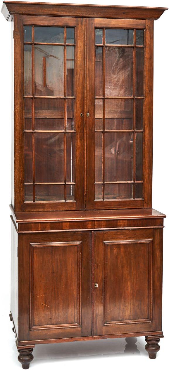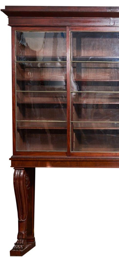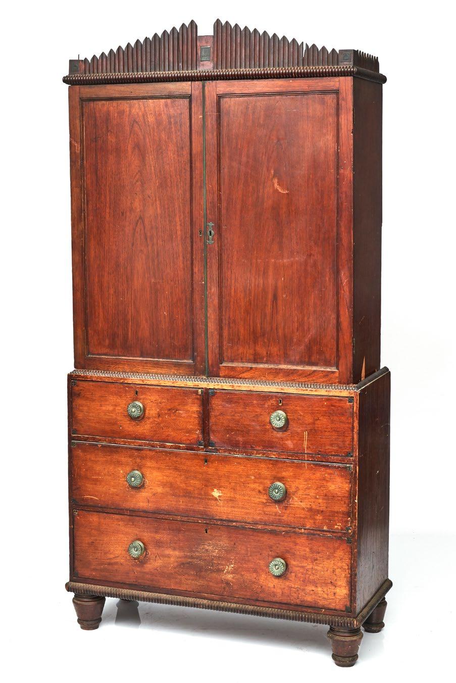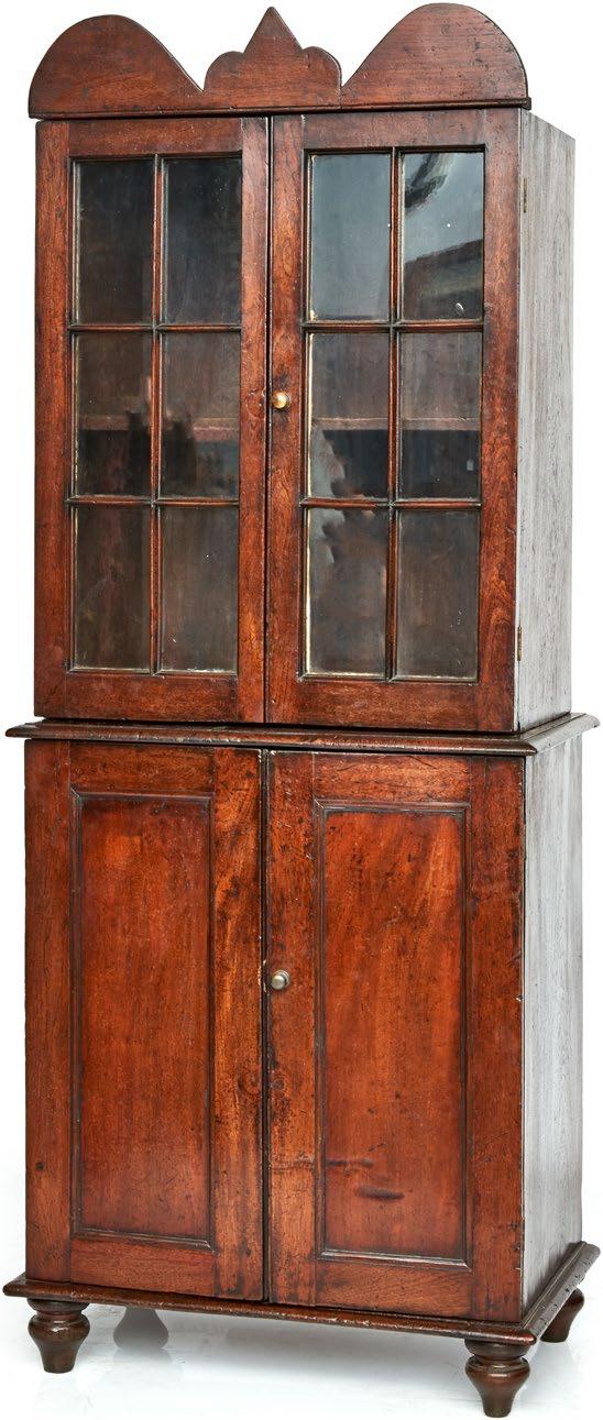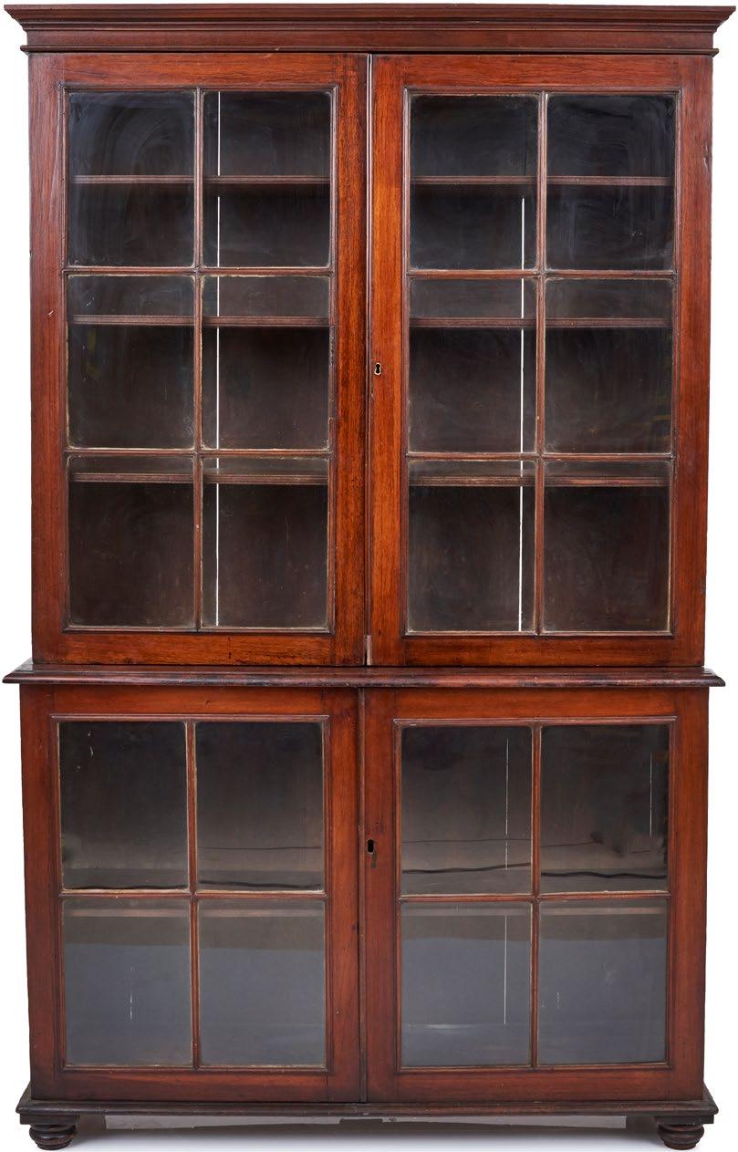 For a pediment carving of almost identical form, refer to the ‘Wallalong Bookcase’ by Hill and Sons illustrated in Australian Furniture Pictorial History and Dictionary 1788-1938, Kevin Fahy and Andrew Simpson, Casuarina Press, Sydney, page 184. It therefore could be suggested that this wardrobe was commissioned for Dr Walter Scott of Wallalong NSW. $2,500–4,000