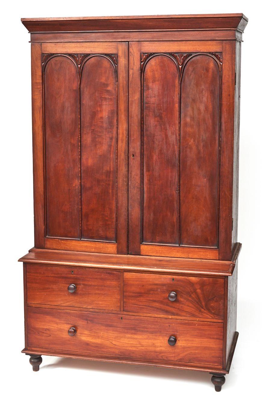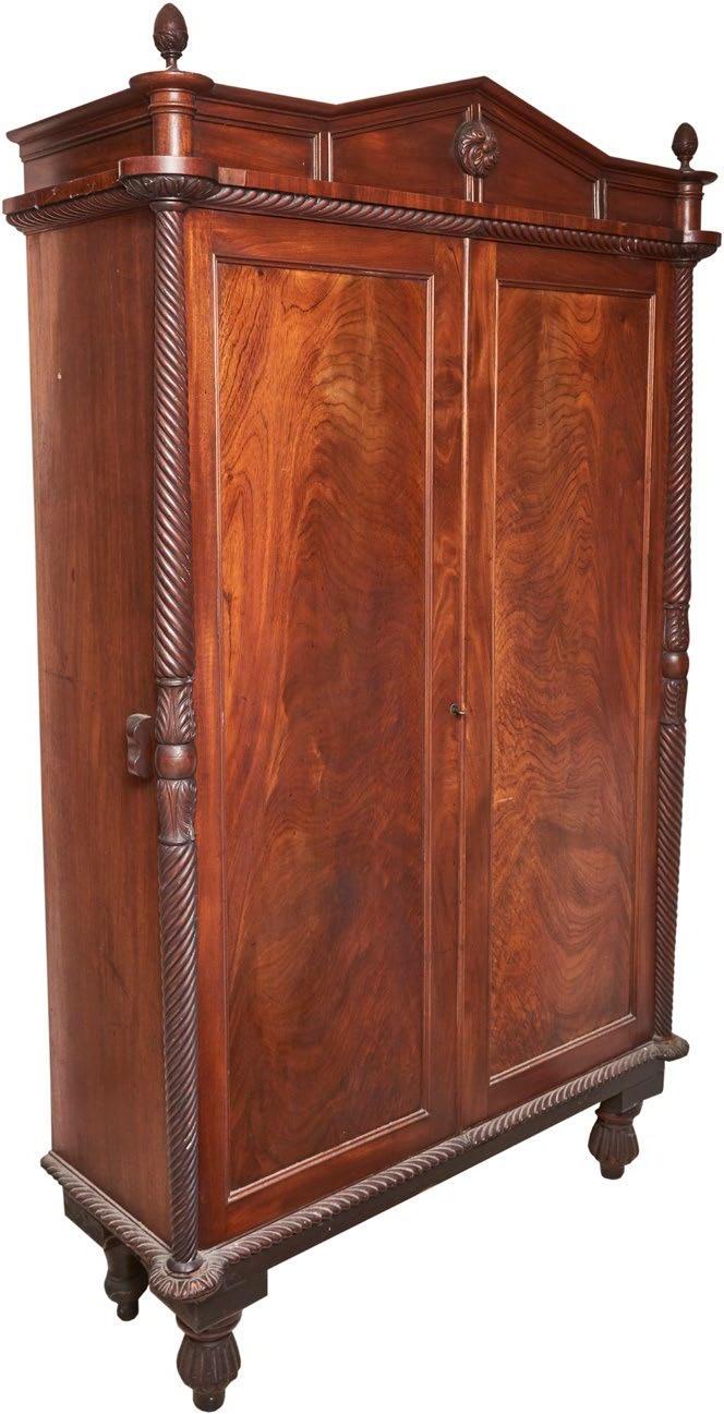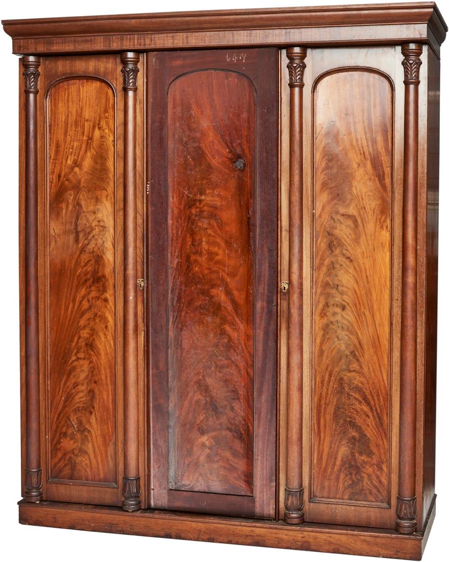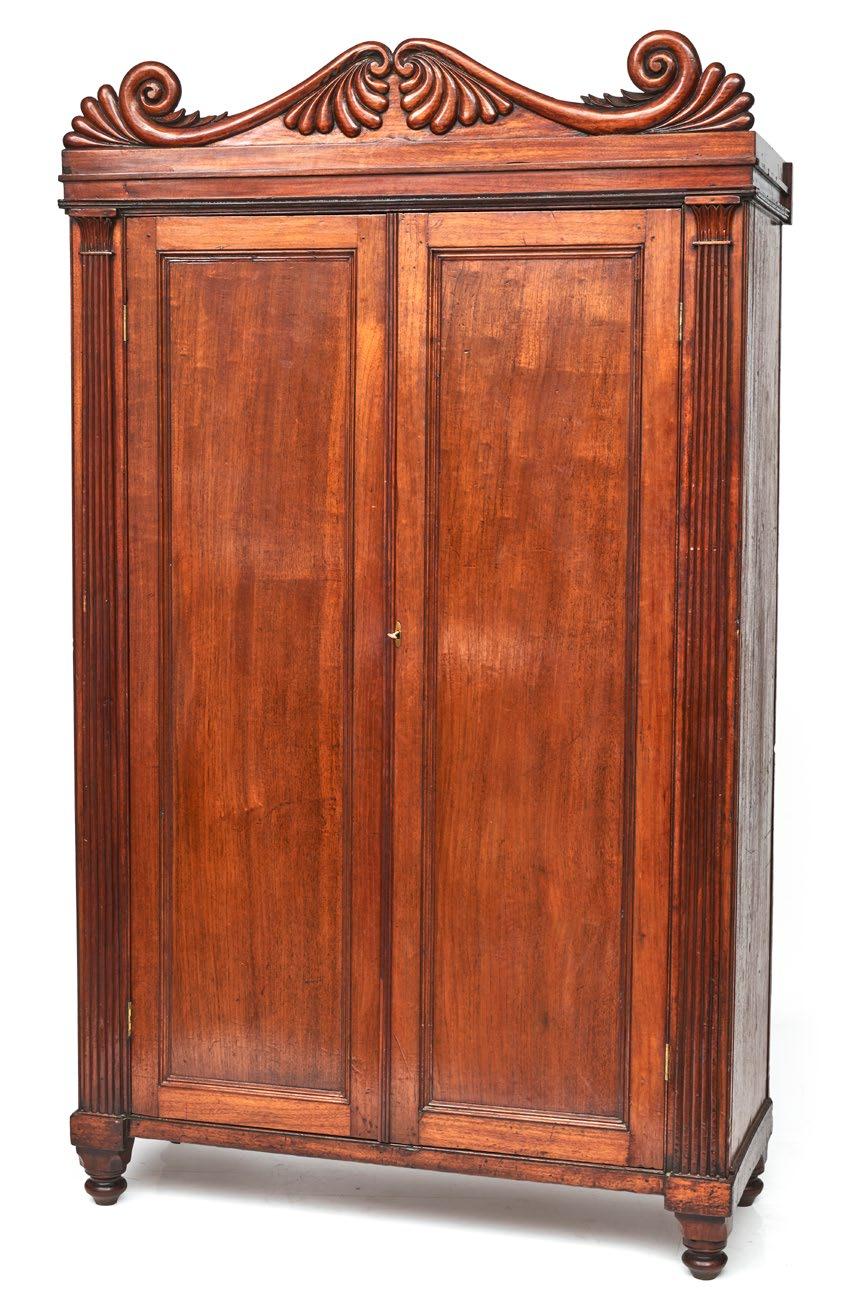 A good quality and very impressive cedar three-door wardrobe, Australian, circa 1850 with tall carved flat pilasters 190cm wide, 230cm high $4,000–6,000