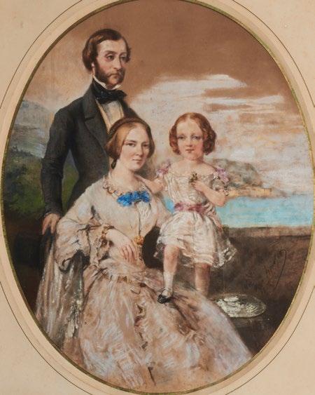 Portrait of a young couple with a child charcoal, watercolour and body-colour, signed Alice Hausers? and dated 1857
