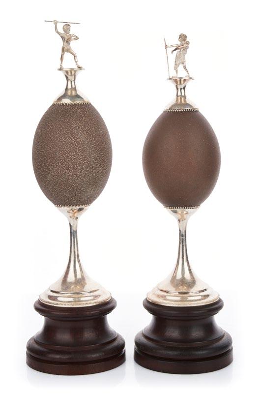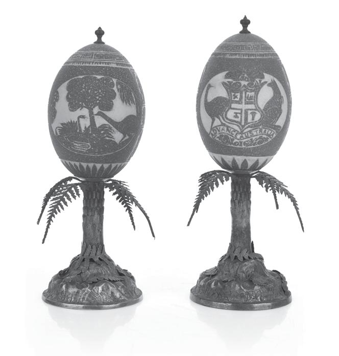 A pair of white-metal mounted carved emu-eggs on stands, Australian, 19th century carved with Advance Australia and the Australian coat-of-arms