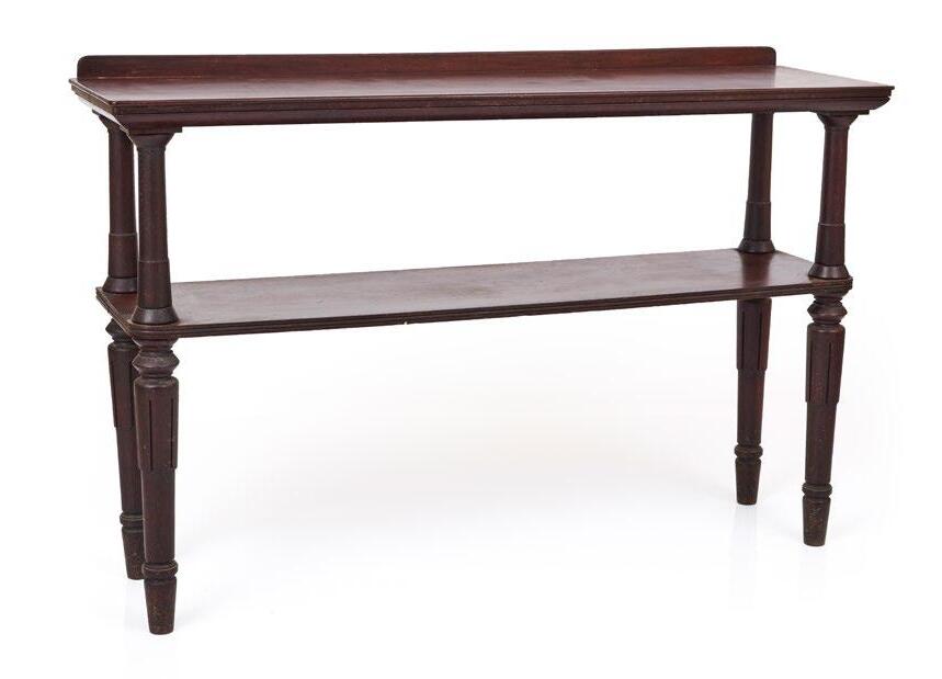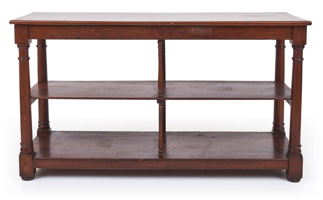 An unusual Australian cedar servery/whatnot, Australian, circa 1850 having a small raised back on top shelf, the middle shelf being reeded. The midsupports have stepped turning with collar at top and bottom. The legs are turned with centurion skirt with tapered bottom legs. Long rectangular shape.
