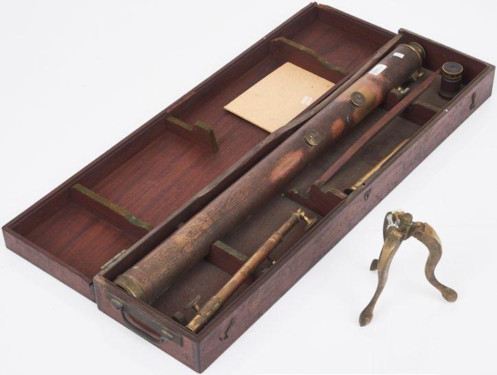 A brass telescope and stand engraved Thomas Dawson Sydney, 19th century in original mahogany case and with extra fitments telescope 87cm long, closed lens diameter 6cm $700–1,000