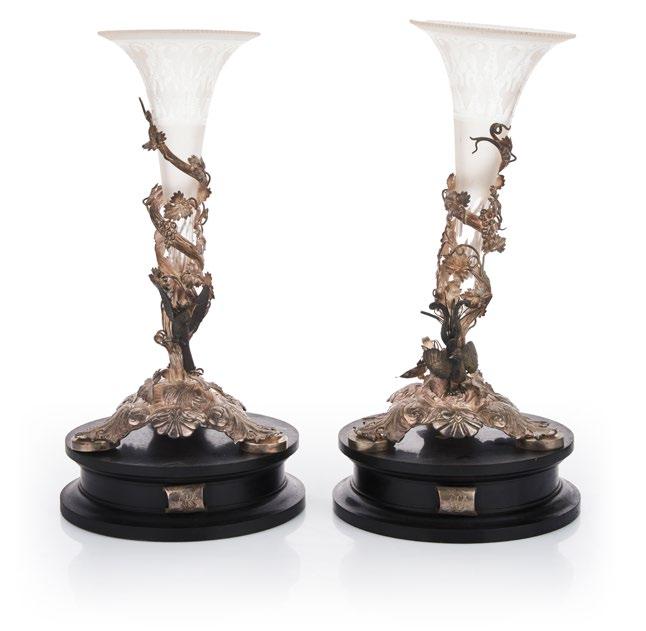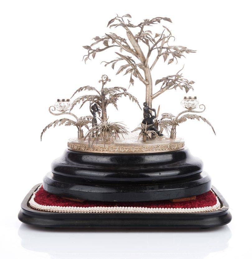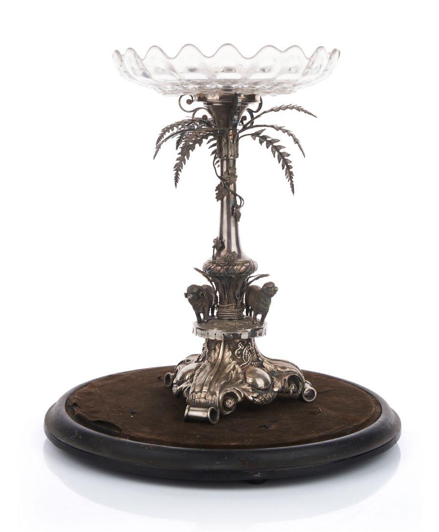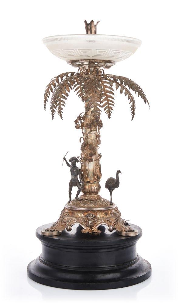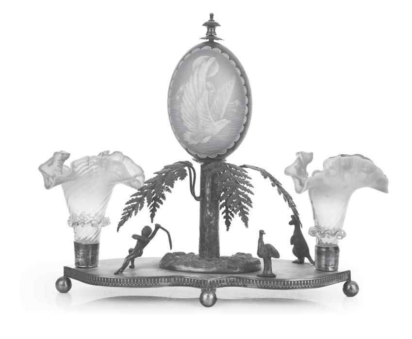 A carved emu egg and silver-plated and pink glass centre-piece, English manufacture for the Australian market, 19th century