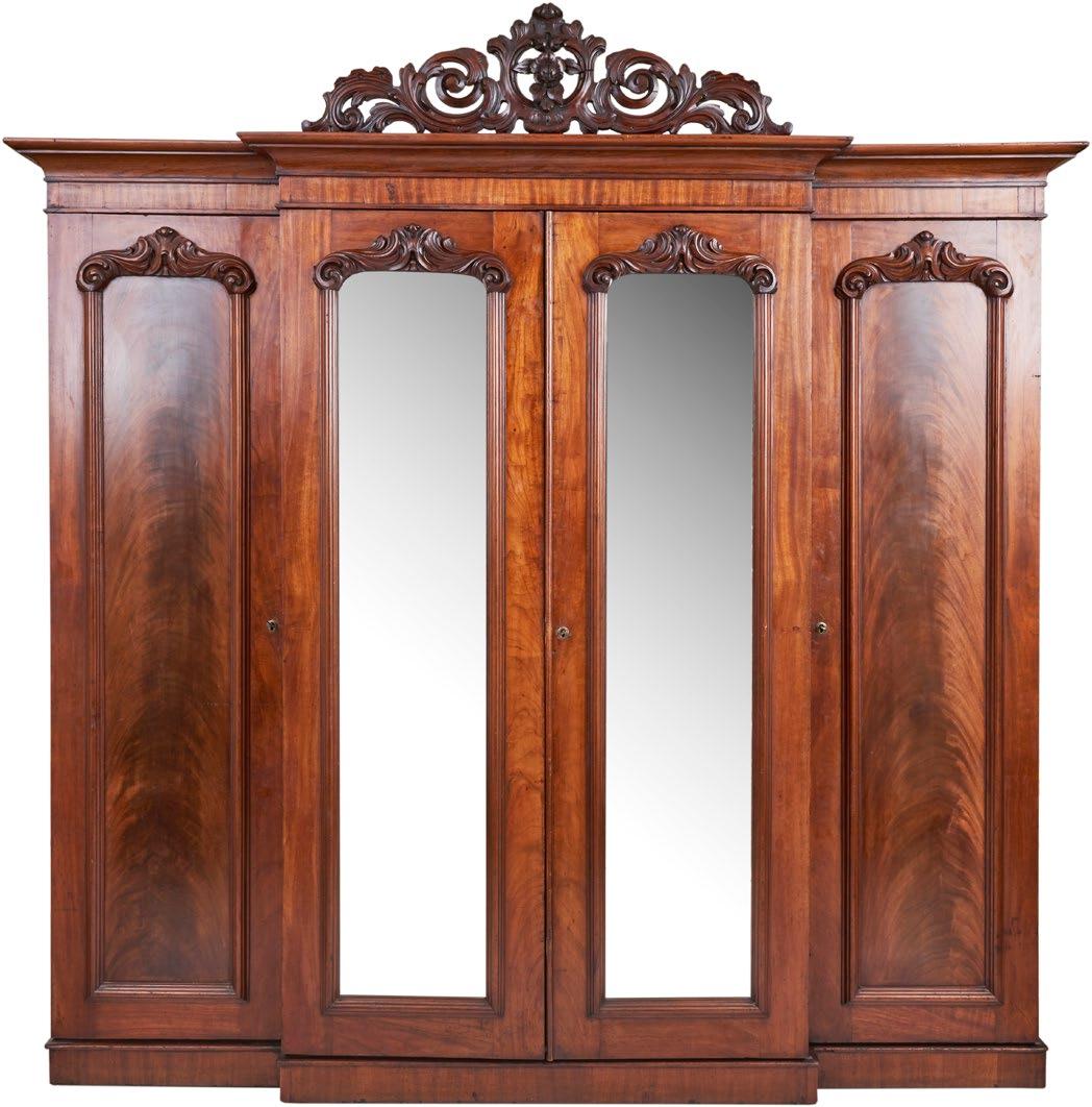 A fine carved cedar breakfront wardrobe by Hill and Sons, Sydney, Australian, circa 1860 with Hill and Sons paper maker's label to verso 245cm high, 242cm wide, 60cm deep