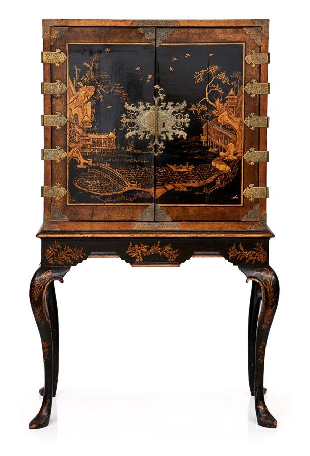 An impressive Chinoiserie black-lacquered oak cabinet-on-stand, English, early 18th century