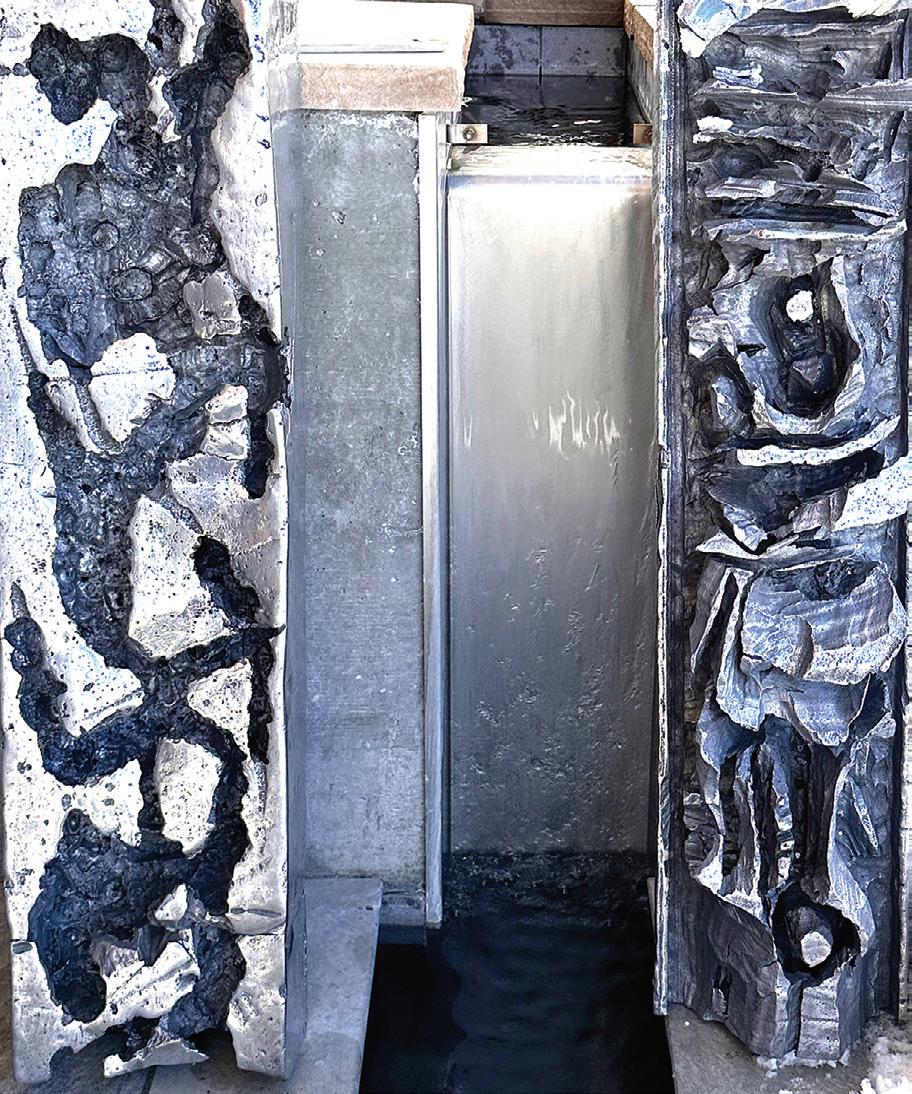 After an inspired meeting with David at the home, it was decided that one sculptural piece, located in the center of the main outdoor living courtyard, would introduce water into the system as a bubbler. The second piece was to be designed to receive overflow water from the waterway fed by the bubbler. This piece was to be seen from the dining table and would have many voids and platforms through which the water would cascade, creating a gentle and pleasing sound.