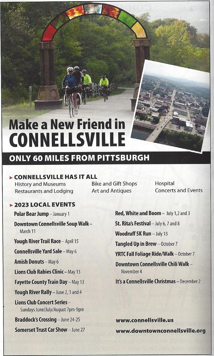 Downtown Connellsville advertised the city of Connellsville in the Trail Guide. This Trail Guide is published for users of the Great Allegheny Passage.