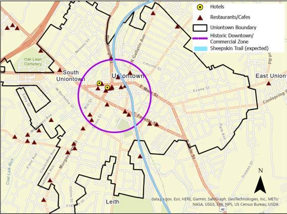 During the course of our asset mapping, we overlaid locations of restaurant/cafes and hotels from online sources on the Downtown Uniontown map (Fig. 2). A closer look at the commercial zone shows a significant number of cafes/restaurants to cater to the Sheepskin trail, but fewer hotels in the Downtown location. This presents an opportunity for trail-centric development in the downtown area, especially in the empty or abandoned buildings that were witnessed during our team’s visit.