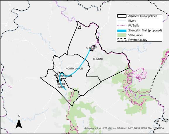 The Sheepskin trail lies approximately on the existing rail-link passing through Uniontown and connecting it with Dunbar to the north, which provides connection to the Greater Allegheny Passage (GAP) trail near Connellsville (Fig. 1). Development of the Sheepskin trail relies on coordination with municipalities adjacent to Uniontown, and the long-term success of the trail will also rely on cooperation with these municipalities.