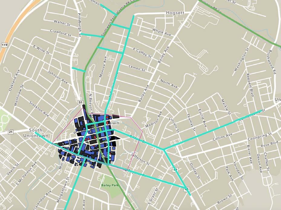 This current geographic analysis shows us there are numerous opportunities for development along the proposed Sheepskin Trail. Uniontown itself is located in the beautiful Laurel Highlands, and it’s close to popular tourist destinations like Ohiopyle. With the Sheepskin Trail, Uniontown can become a new destination for tourists of this already popular area. Next we will be zooming into downtown Uniontown.