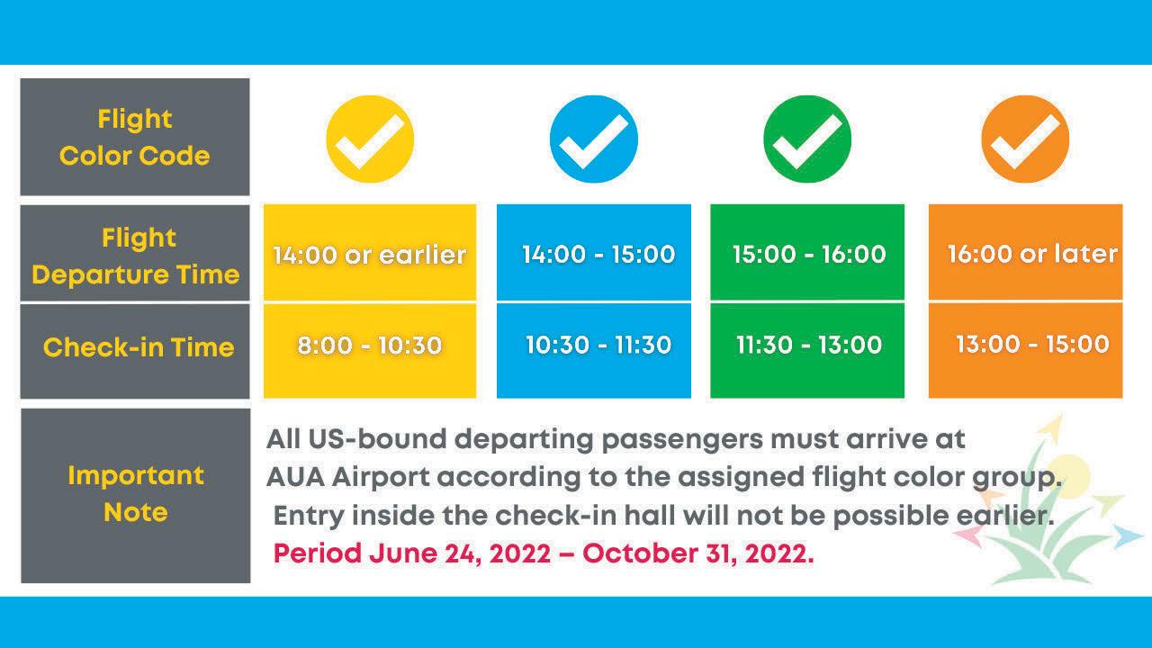Passenger Flow Control for US-Bound Flights A R U B A A I R P O R T A U T H O R I T Y N V w w w . a i r p o r t a r u b a . c o m The Passenger Flow Control concept entails that passengers are allowed to enter the check in facilities based on separate groups established by the scheduled airline departure times. Passengers will thus receive a dedicated timeslot to enter the terminal as indicated in table below 101% 104% 99% R e v e n u e G e n e r a t i n g P a s s e n g e r s 2 0 1 9 v s 2 0 2 2 2019: 106,380 2022: 105,788 April May June Q 2 2 0 2 2 R E C O V E R Y 2019: 98,133 2022: 101,570 2019: 109,808 2022: 110,983 S o u r c e : A r u b a A i r p o r t A u t h o r i t y