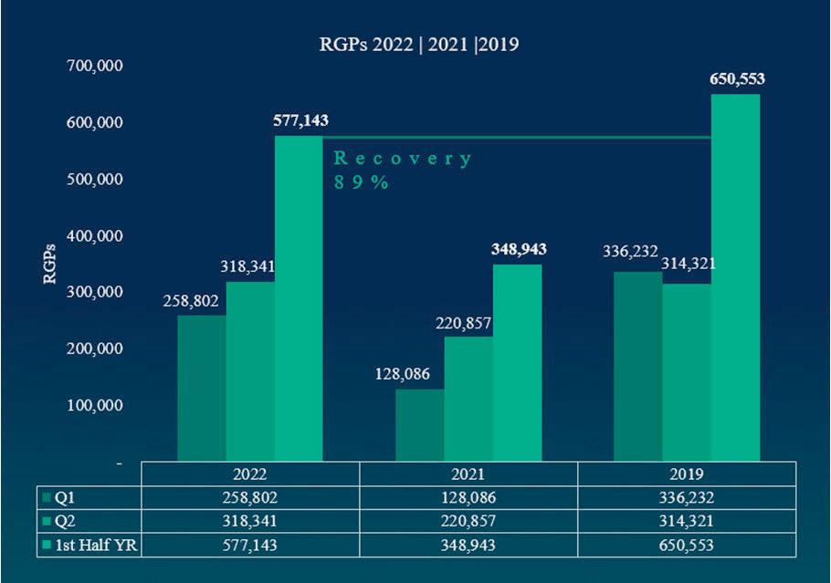 Passenger numbers increased considerably in the 2nd quarter showing excellent recovery rates versus the same period in 2019. The total amount of revenue generating passengers handled in the first half of 2022 was recorded at 577,143 which represents a recovery of 89% versus that same period of 2019