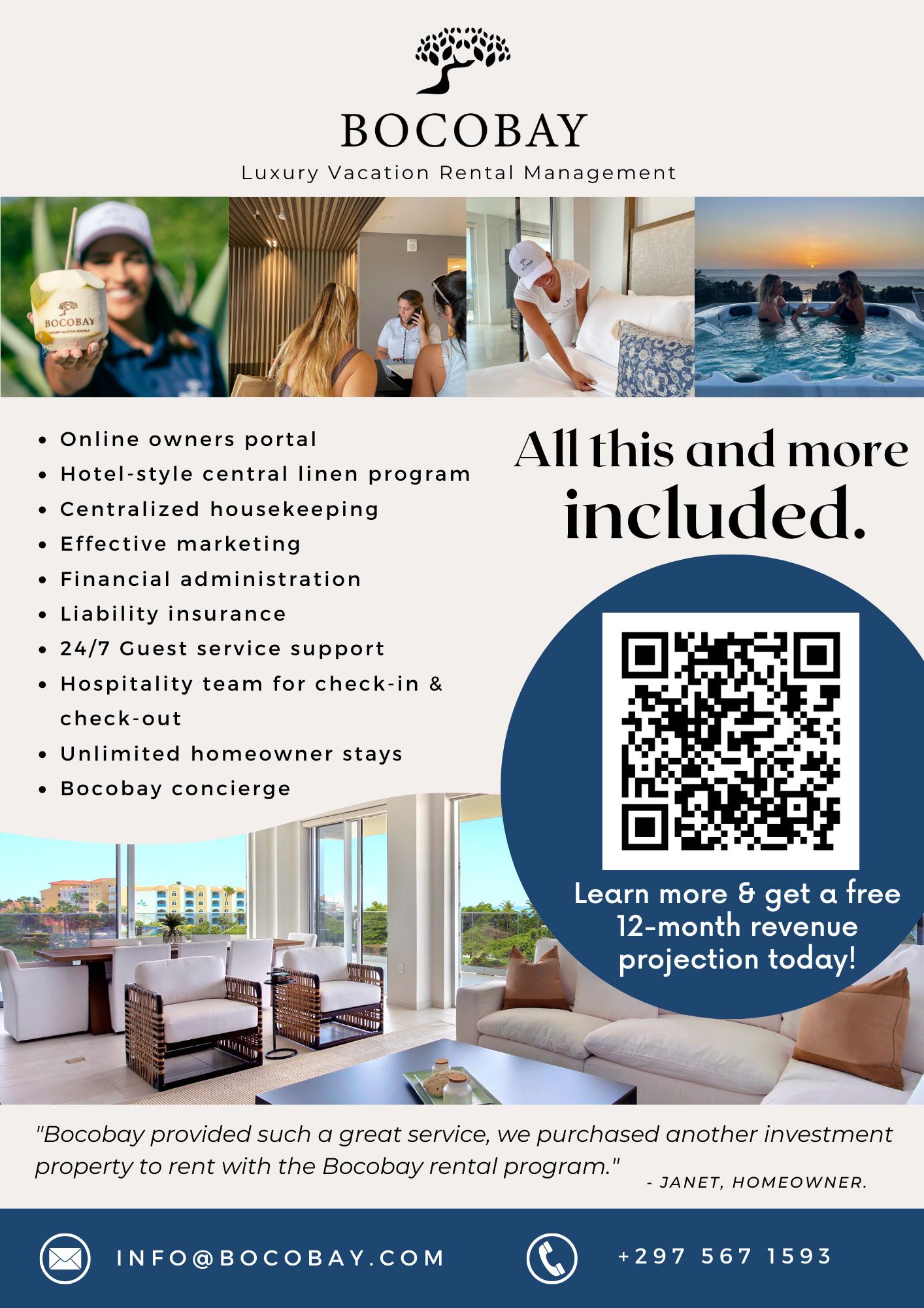 Property Management +2000 reviews NoMonthlyFee +80 properties F or M ore I n for ma t i on Sca n t h e Cod e info@vacationaruba.com