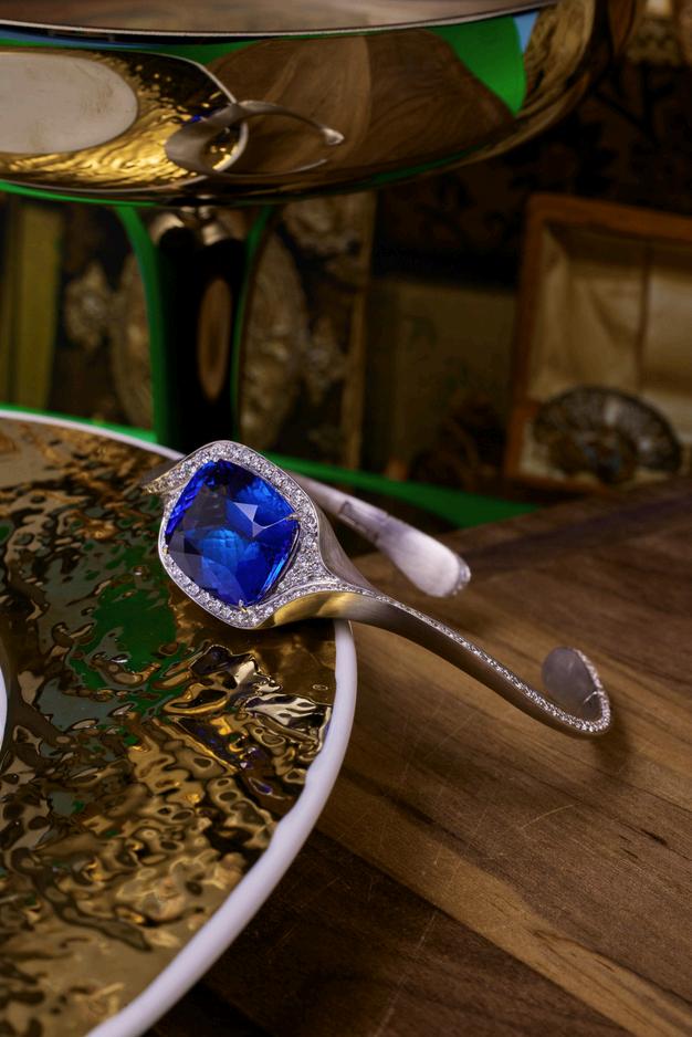 Rooted in myth and mysticism, the Tanzanite Bangle becomes a portal between inner vision and outer reality Drawing from Hindu and Buddhist traditions, it echoes the symbolic third eye seat of wisdom, clarity, and spiritual awakening while conjuring the surrealist gaze of Magritte’s “The False Mirror,” where the eye becomes both witness and mirror to the soul The bangle transcends adornment, becoming an emblem of perception and selfreckoning. Its oceanic hues evoke the depths of the subconscious and the unknowable mysteries of nature Like the sea, it invites introspection, reminding us that most of our truths lie beneath the surface Both the wearer and the observer are drawn into this quiet alchemy, where enlightenment, creativity, and cosmic curiosity converge In this piece, art, mythology, and the unseen intersect, offering not just beauty but vision