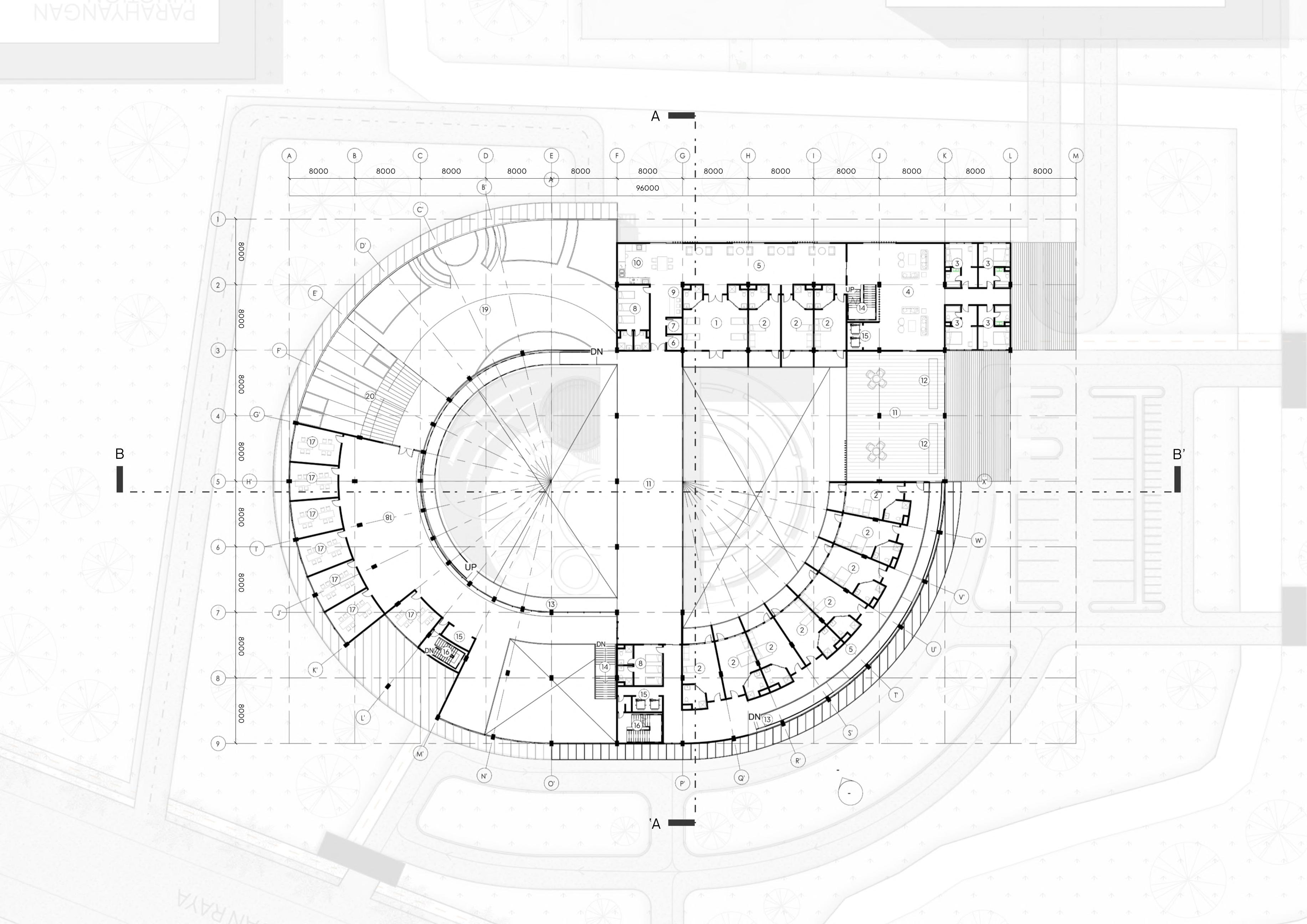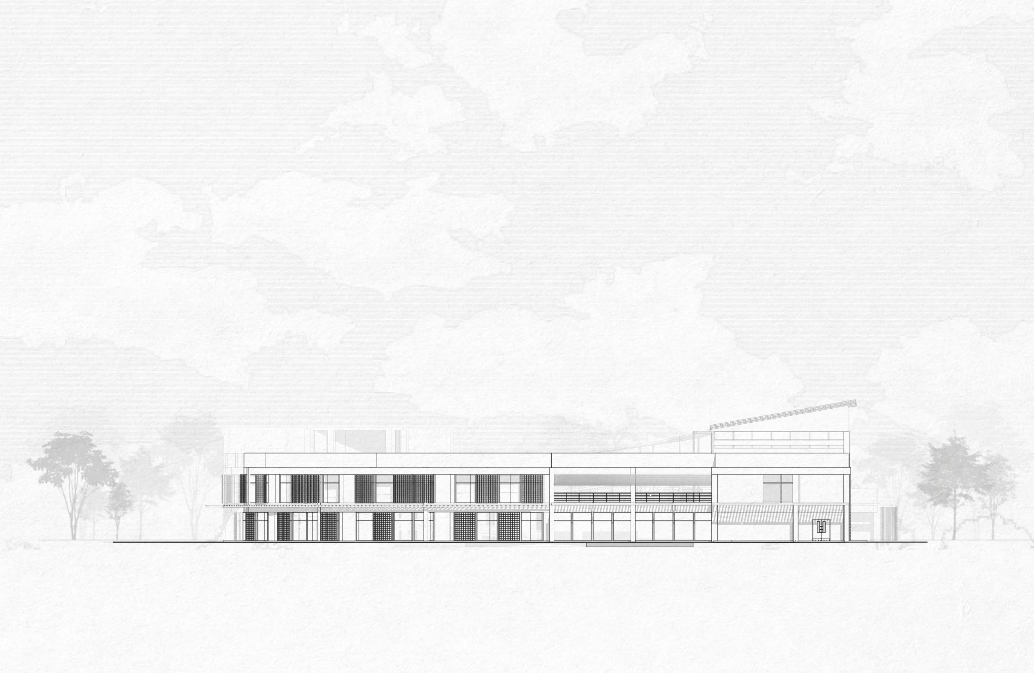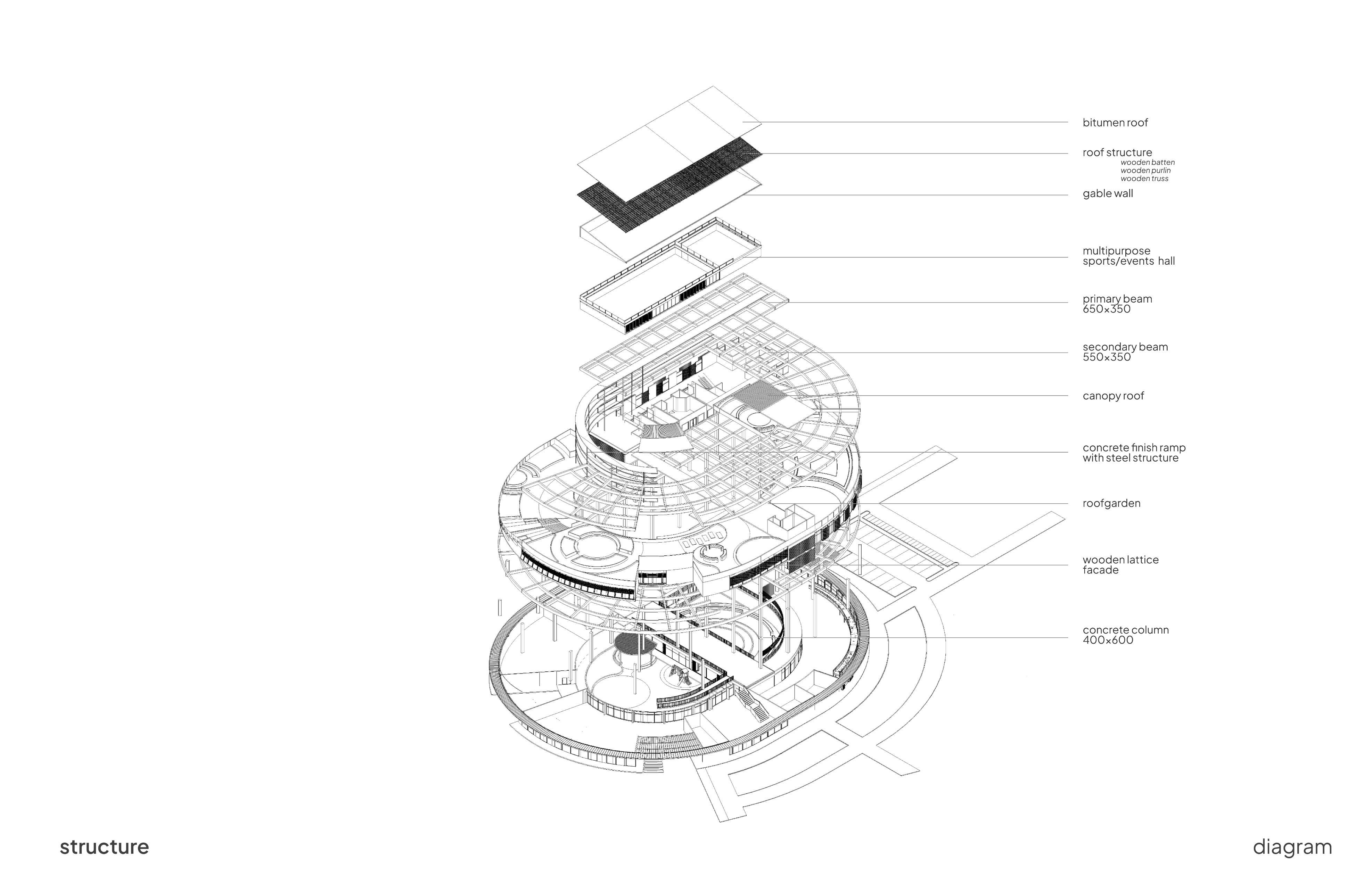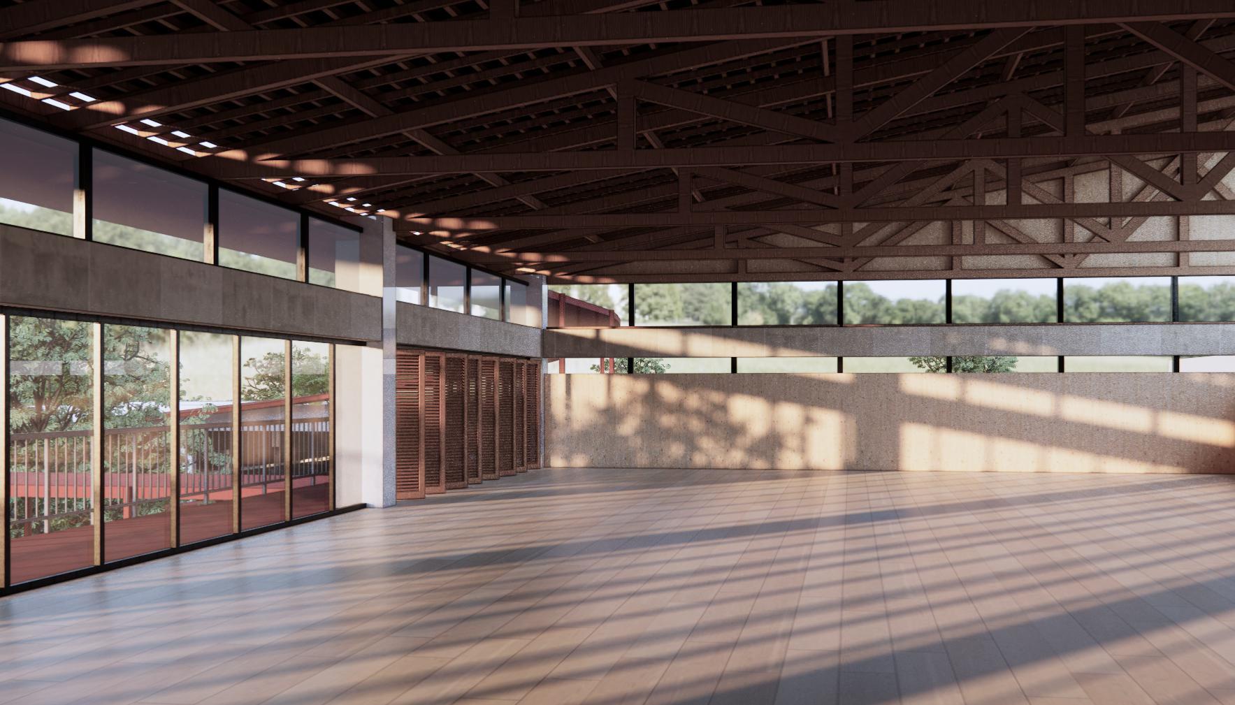 besides sports, this event hall may also be functioned as a seminar hall. for example, a healthcare seminar for the elderly. the pivoting door & openings give this hall natural lighting & ventilation. giving the users a view towards the roofgarden & courtyard