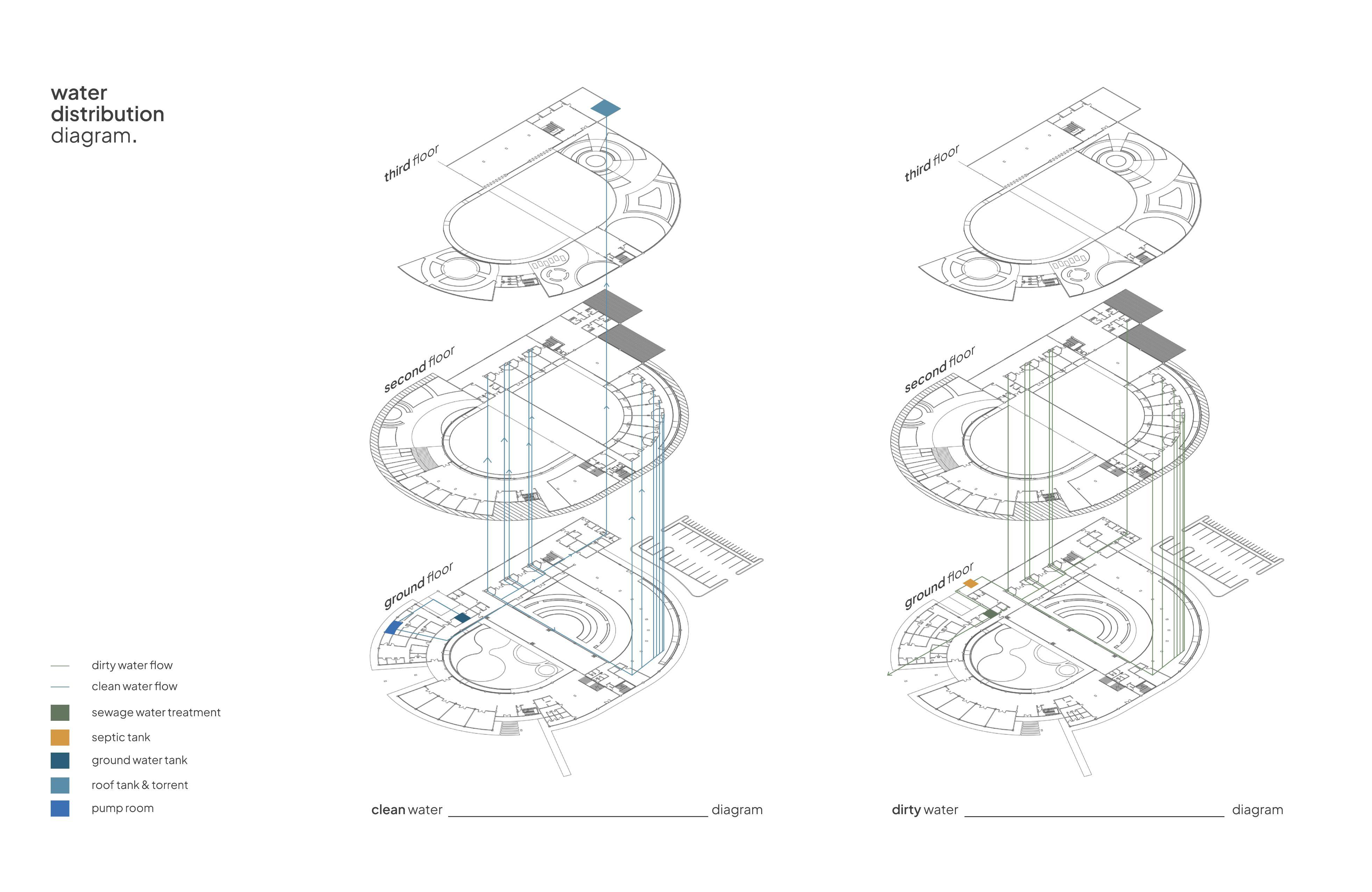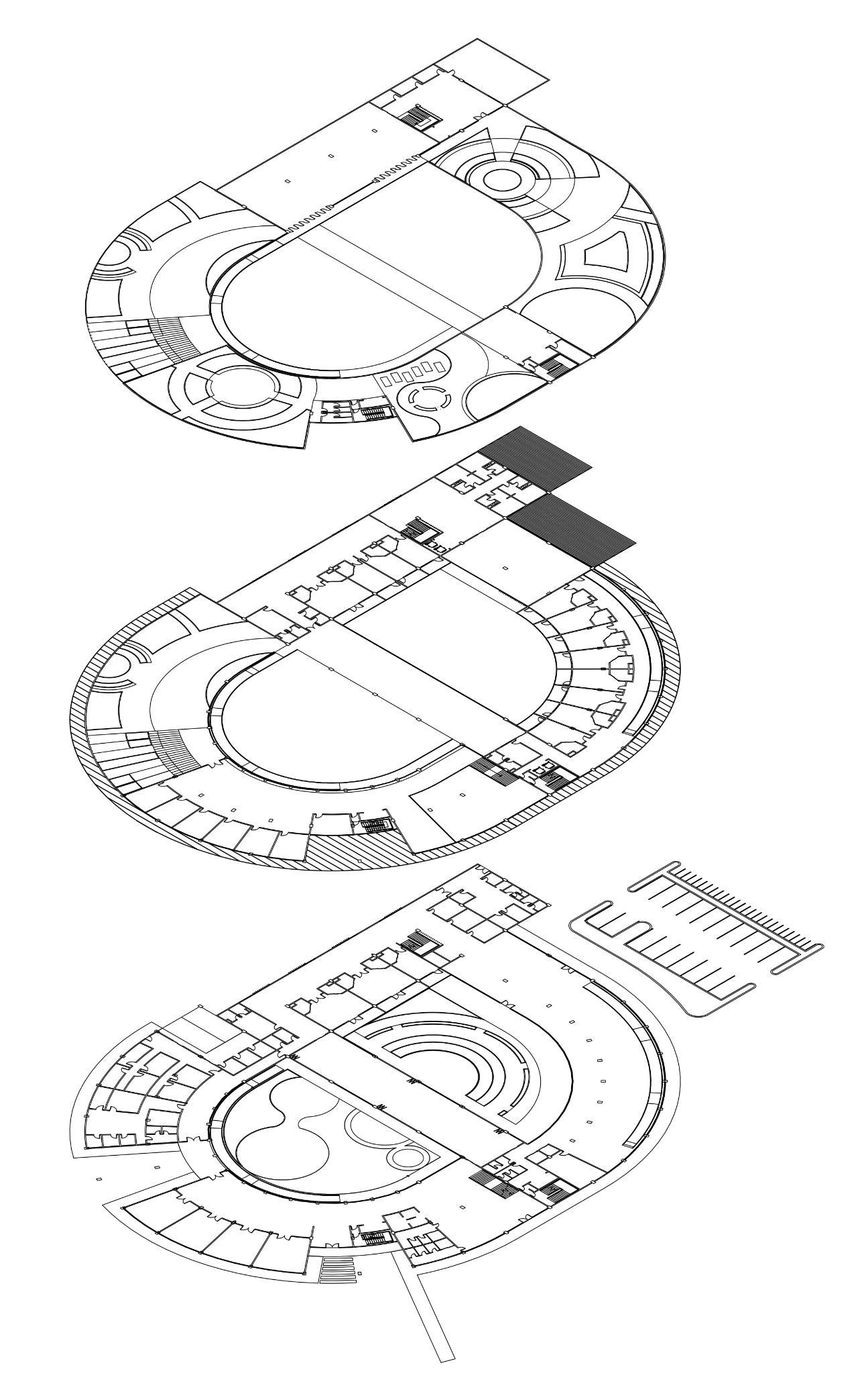 the third floor multipurpose sports/events hall is quite different from the first floor as it doesn’t have the partitions needed to divide the hall into smaller rooms. however, it’s designed with the standard size for multiple indoor sports so that its function can switch between sports easily. it’s also made rentable for the public on the weekends so that the local community may make use of it as well.