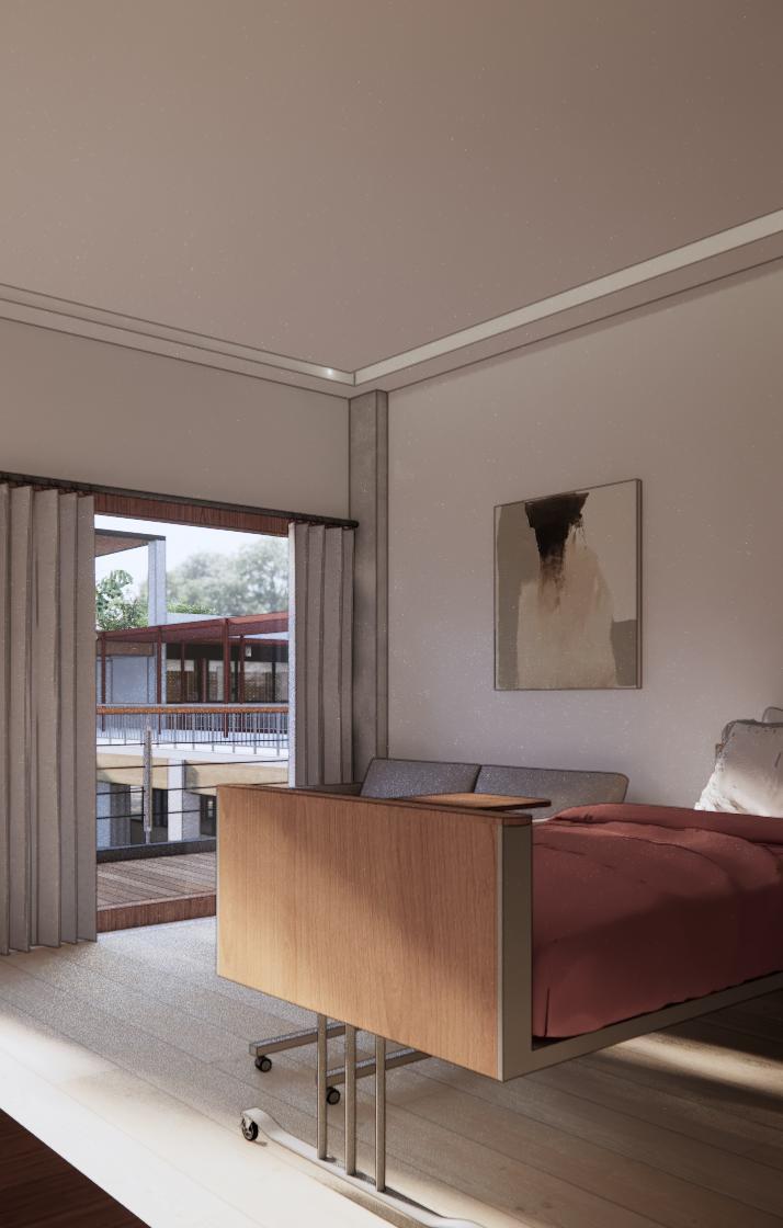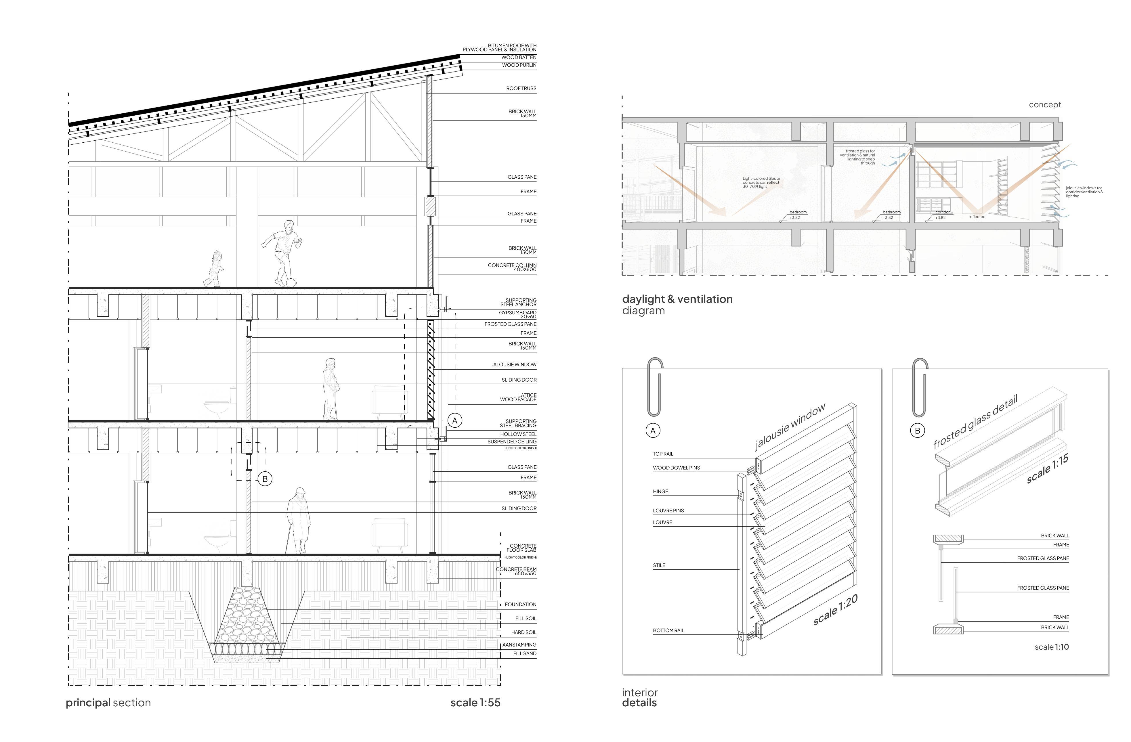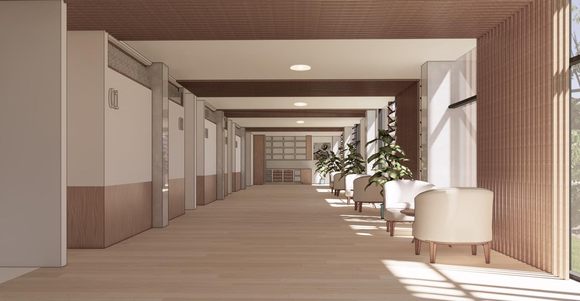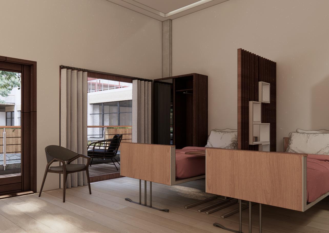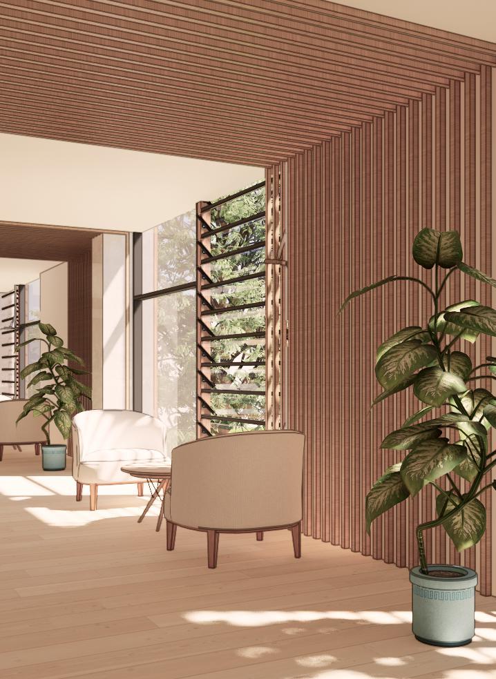 the elderly living facility’s rooms are placed with a fairly wide corridor as it is also functioned as a seating area. the corridor’s walls are designed with windows in which some are jalousie windows to not only allow light to seep through but also ventilation. the corridor is also designed to feel as homey as possible to make the elderly feel safe & at home.