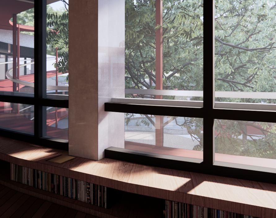 Lining the edges of this communal hub is the library windowsill, a continuous, child-height bench built into the glazed façade, inviting children to read, rest, or simply watch the world outside