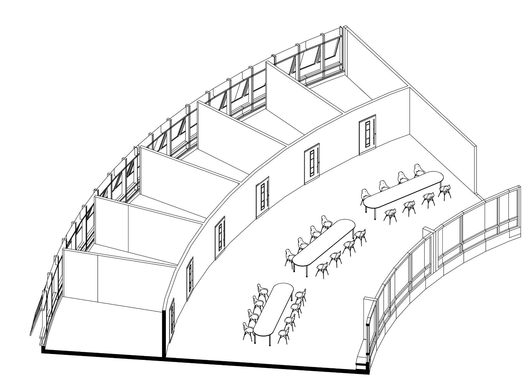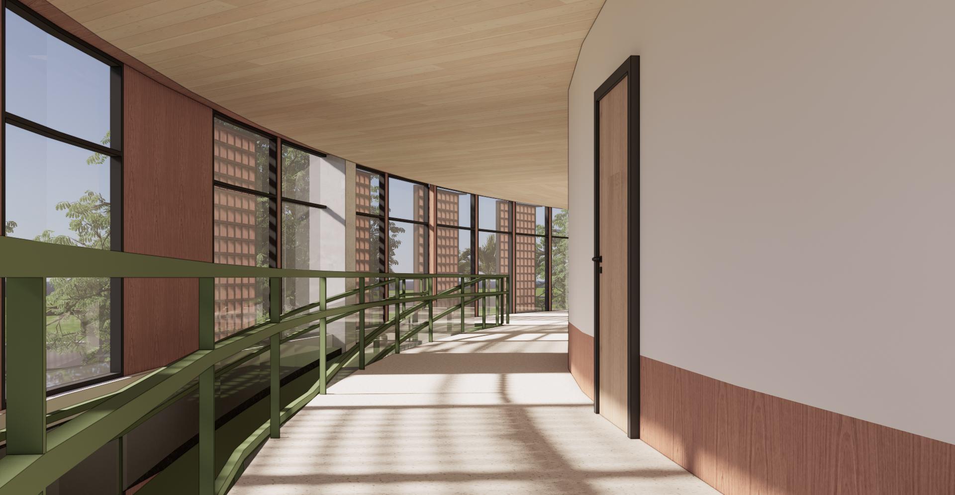 the corridor on the rounded side of the elderly living facility is directly accessible through the indoor ramp. it also provides a clear view towards the outdoors through the windows installed with a sun shading facade.