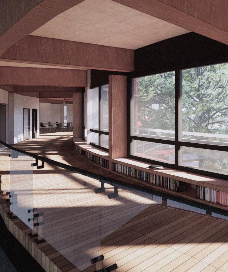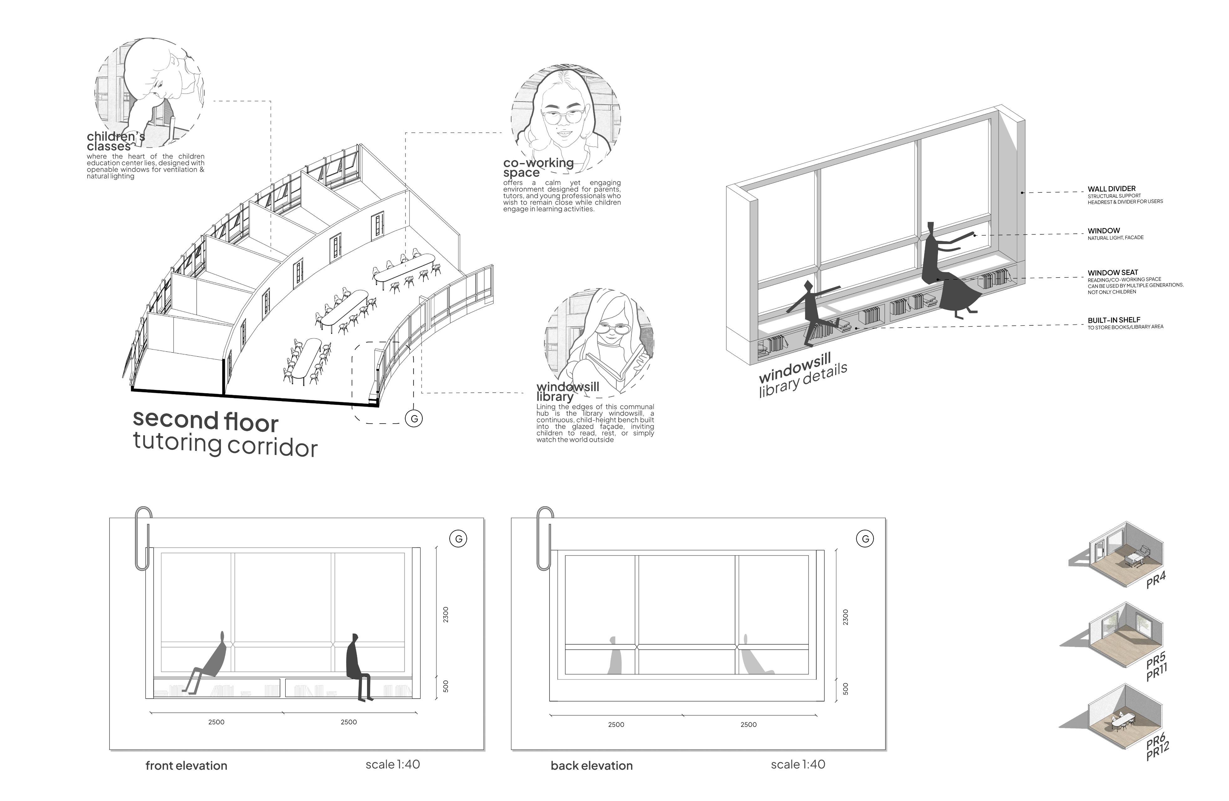 the children education center’s second floor corridor’s window is made into a seating/reading area by installing a shelf under the window sill that can be seated on. the wall divider is also made to be a place where the users can rest their head on.