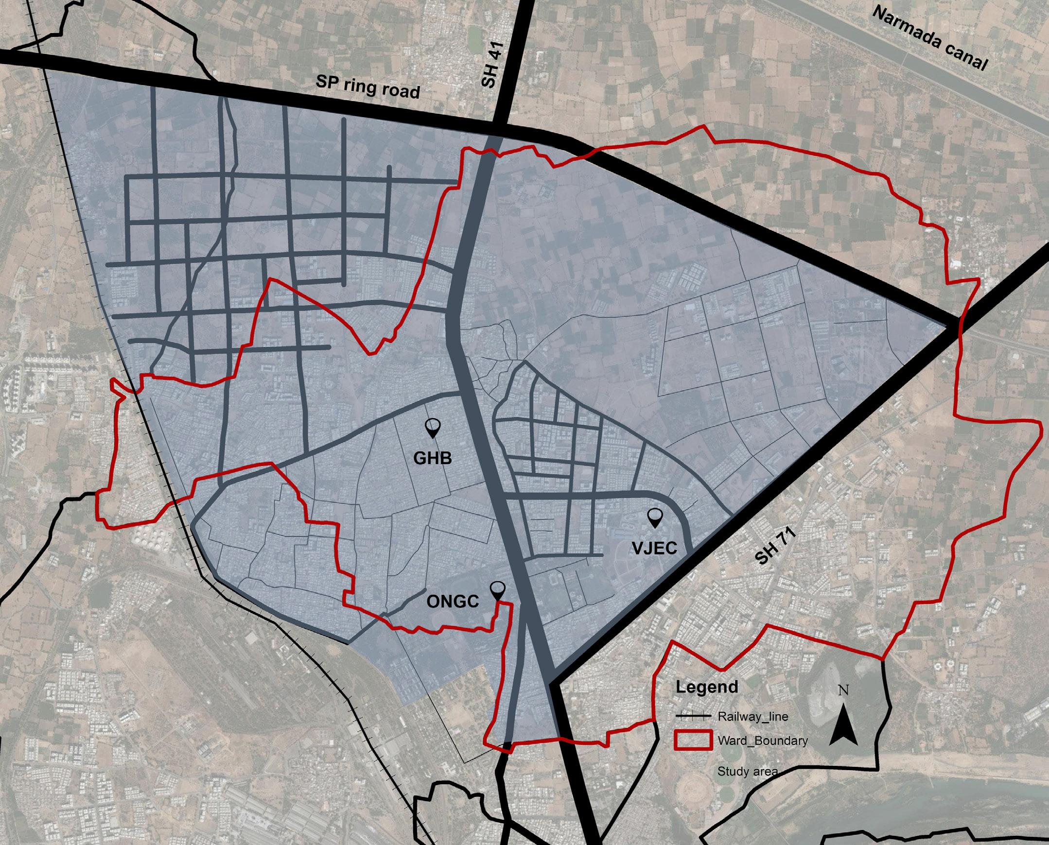 The ward boundary of Chandkheda is not solely considered for the study purpose. A new study boundary is delienated for this studio exercise. The Study area is defined by major arterials, towards north bounded by SP ring Road, SH 41run across the ward ,on the east it has SH7 and on the other side by the railway line.The ward has overlap of Jurisdictions.It lies between AMC & AUDA Boundaries. Within AMC, it covers wards 01 (Gota) and 03 (Kali).