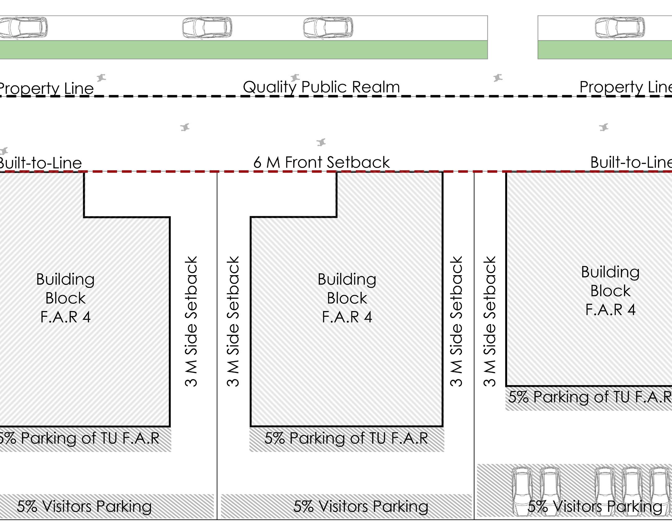 Project 1: Redefining building norms and reorganizing built fabric Fixed front setback and mandatory Builtto-line at 6 meters