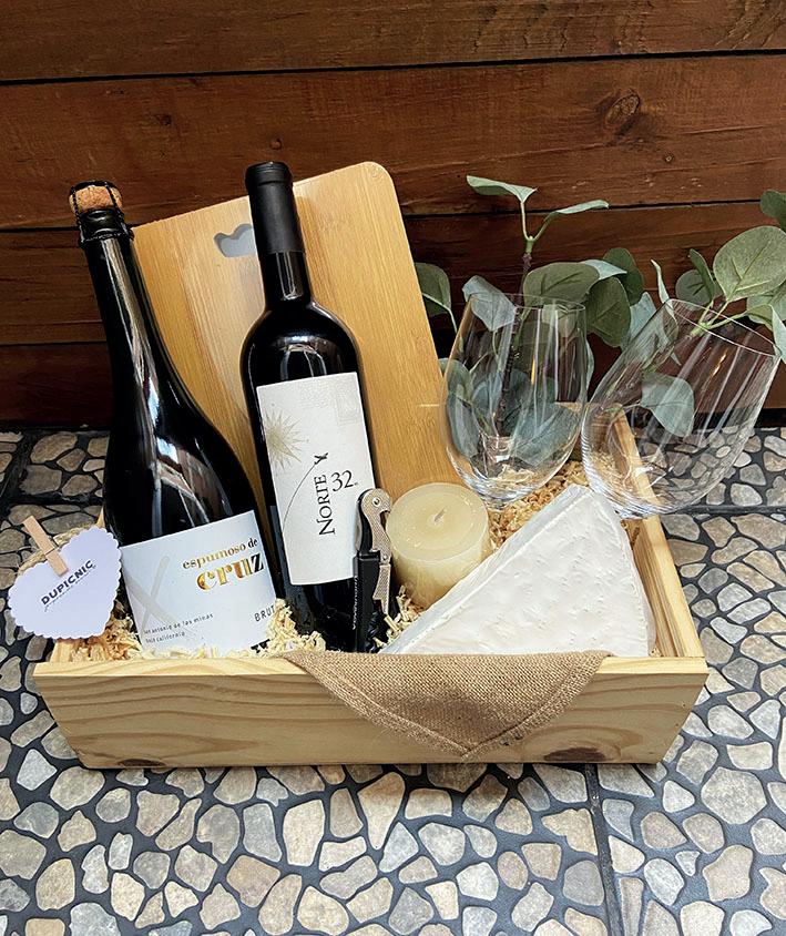 Caja de madera con una botella de vino tinto y una “tabla” de charcutería que puede tener Jamón Serrano, chorizo de Pamplona, queso Brie, Manchego madurado, queso Cheedar, Parmesano, uvas, higos, fresas, nueces, pistaches, blueberries, galletas, chocolates, romero o lavanda
