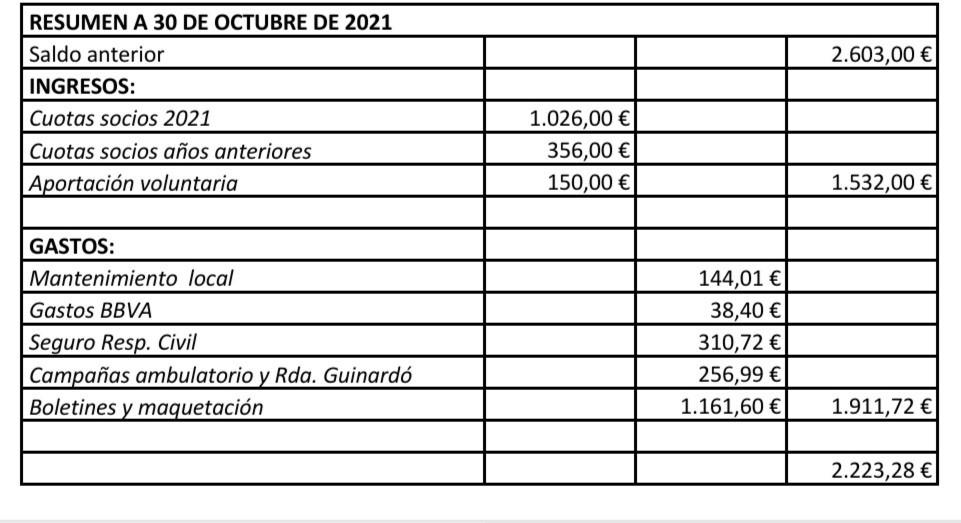 A la hora de pasar cuentas es importante remarcar que estas están cerradas a 31 de octubre y que, desde ahí hastafinaldeaño,tendremosmásgastosytambiénmásingresos,comosepuedever,lascuentas,circunscritas a este año, arrojan un déficit de 379, 72 euros, esto se debe a unos menores ingresos, por cuotas de socios y sobretododelasaportacionesdelostalleres.Ni que decir tiene, que esta situación empezó en marzo de 2020 y el local, con breves periodos abierto y con mucho control en el acceso, ha permanecidocerradohastaseptiembrede2021.