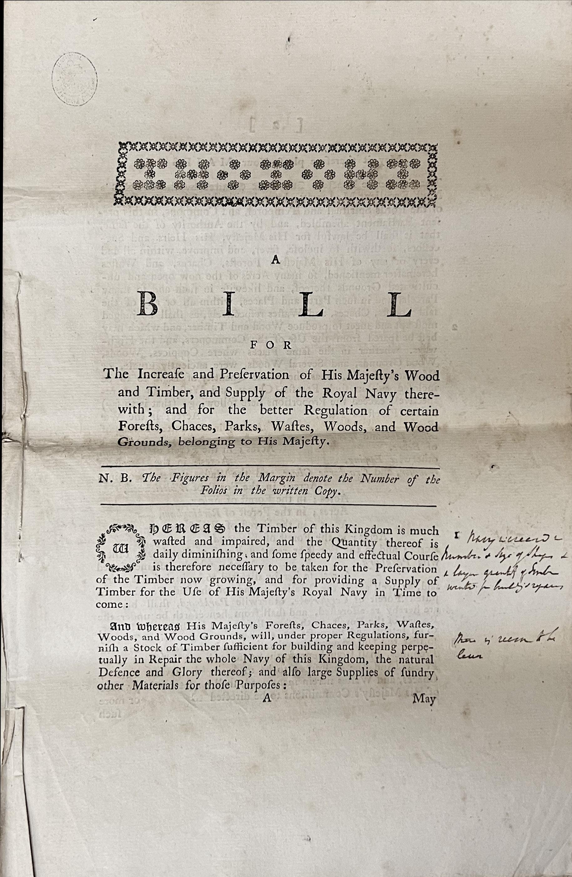 “A Bill for The Increase and Preservation of His Majesty’s Wood and Timber, and Supply of the Navy therewith ... Whereas the Timber of this Kingdom is much wafted and impaired, and the Quantity thereof is daily diminishing, and some speedy and effectual Course is therefore necessary to be taken for the Preservation of the Timber now growing, and for providing a Supply of Timber for the Use of His Majesty’s Royal Navy in Time to come: ... under proper regulations, furnish a Stock of Timber sufficient for building and keeping perpetually in Repair the whole Navy ... the natural Defence and Glory “