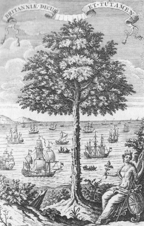 The banner translates to “Britan’s Glory and Protections.” It seems to draw an obvious relationship between the oak tree pictured centrally and its ‘product’ (the naval vessels) in the background. The figure is Britannia, symbolising Great Britain and its care for the oak seedling (pictured in hand). The image can be read as propaganda to support the views of infinte timber resources and the consequent security of the nation.