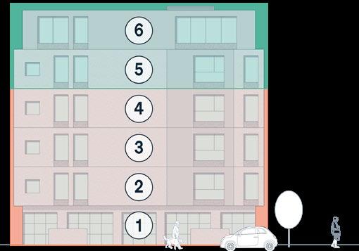 rhythm of punched window openings with deep reveals, complemented by finely detailed balconies with solid panels set perpendicular to the façade. These elements accentuate the building’s vertical rhythm and introduce a refined architectural language. At the top, the massing steps back to accommodate wide balconies on Level 6, providing both outdoor amenity and visual relief.